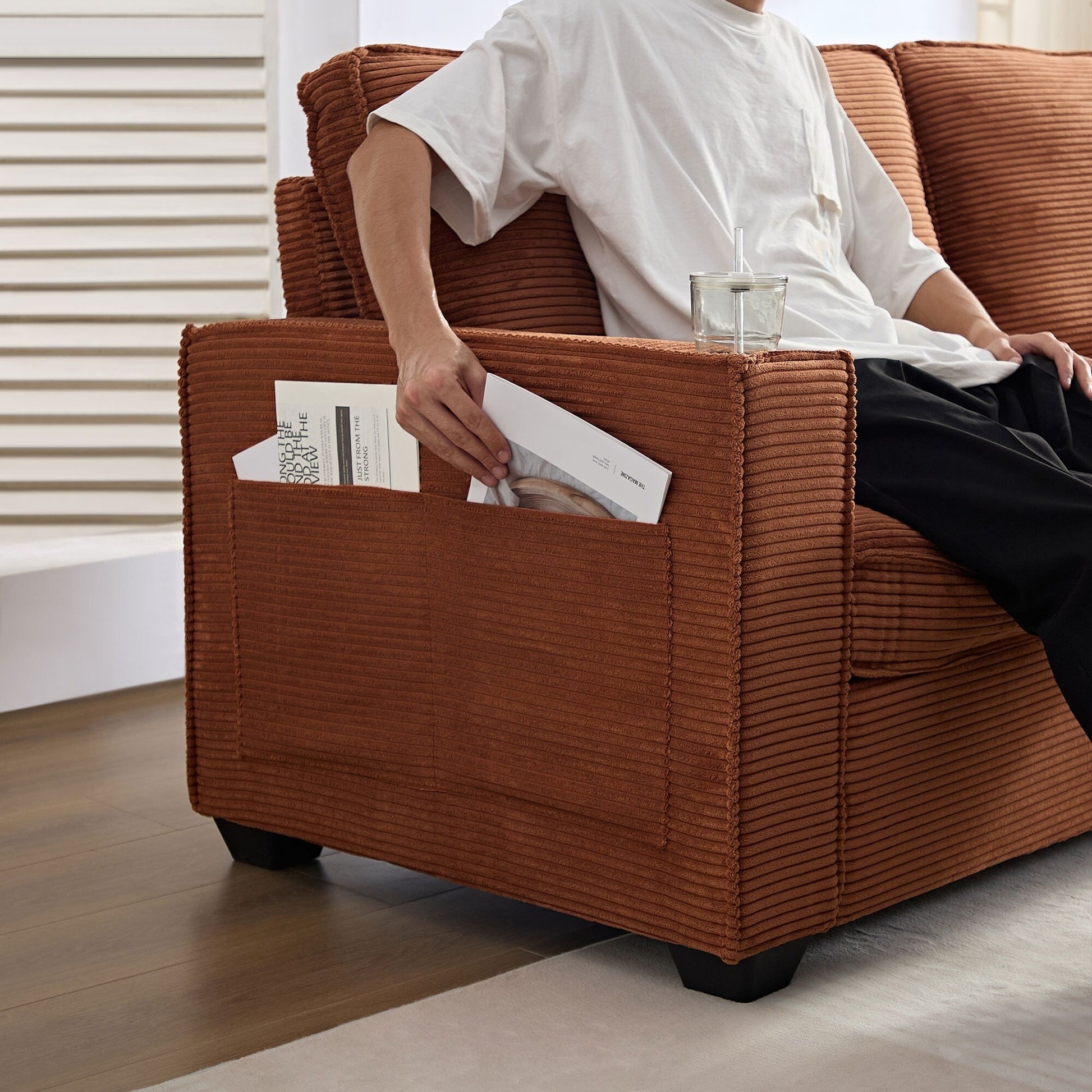 Canapé 3 places en velours côtelé avec porte-gobelet et rangement