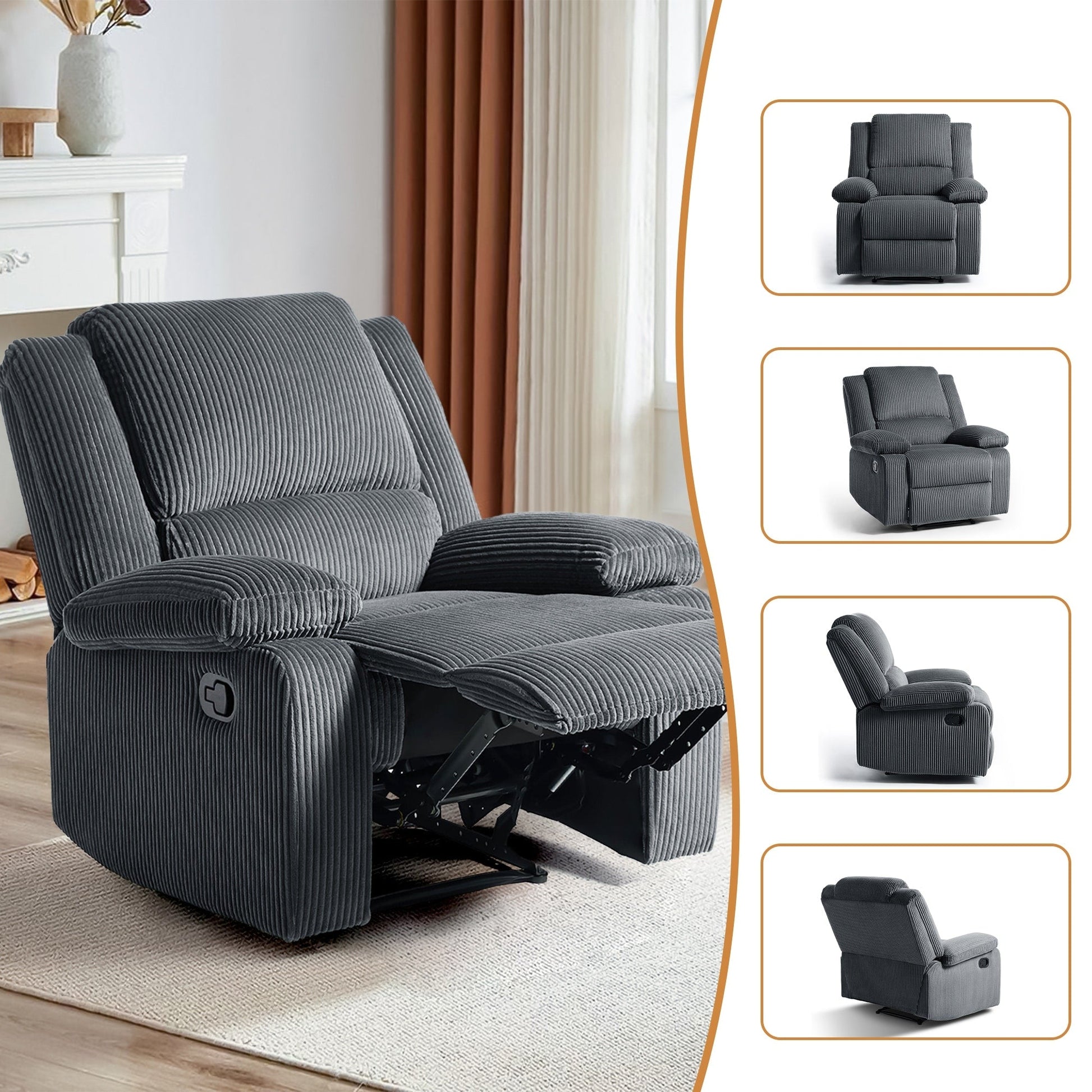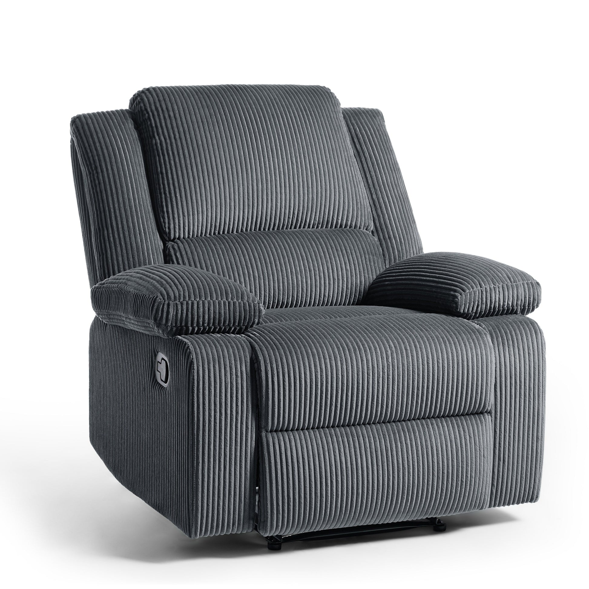 Enveloppez-vous d'un luxe douillet avec notre fauteuil inclinable en velours côtelé, le complément idéal de tout espace de vie moderne. Doté d'un tissu velours côtelé doux et texturé et de coussins en mousse moelleux, il offre l'équilibre idéal entre style et confort pour se détendre, lire ou regarder la télévision. Construit avec une structure robuste en métal et en bois, ce fauteuil supporte jusqu'à 181 kg et s'incline facilement grâce à une simple commande manuelle, vous permettant de trouver la position idéale, de la relaxation verticale au confort optimal. Alliant fonctionnalité et design, ce fauteuil inclinable vous garantit une détente ultime dans chaque recoin de votre maison.