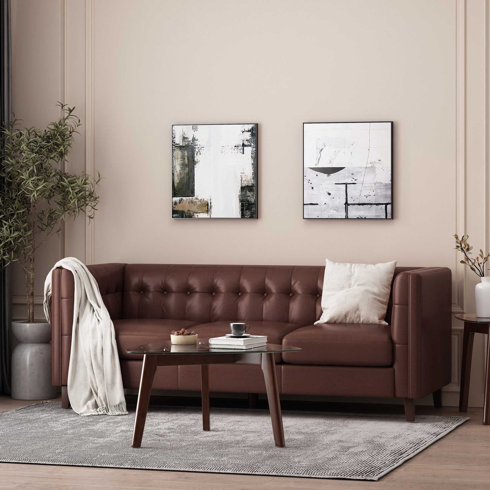Canapé 3 places capitonné en similicuir marron foncé avec pieds en bois de bouleau