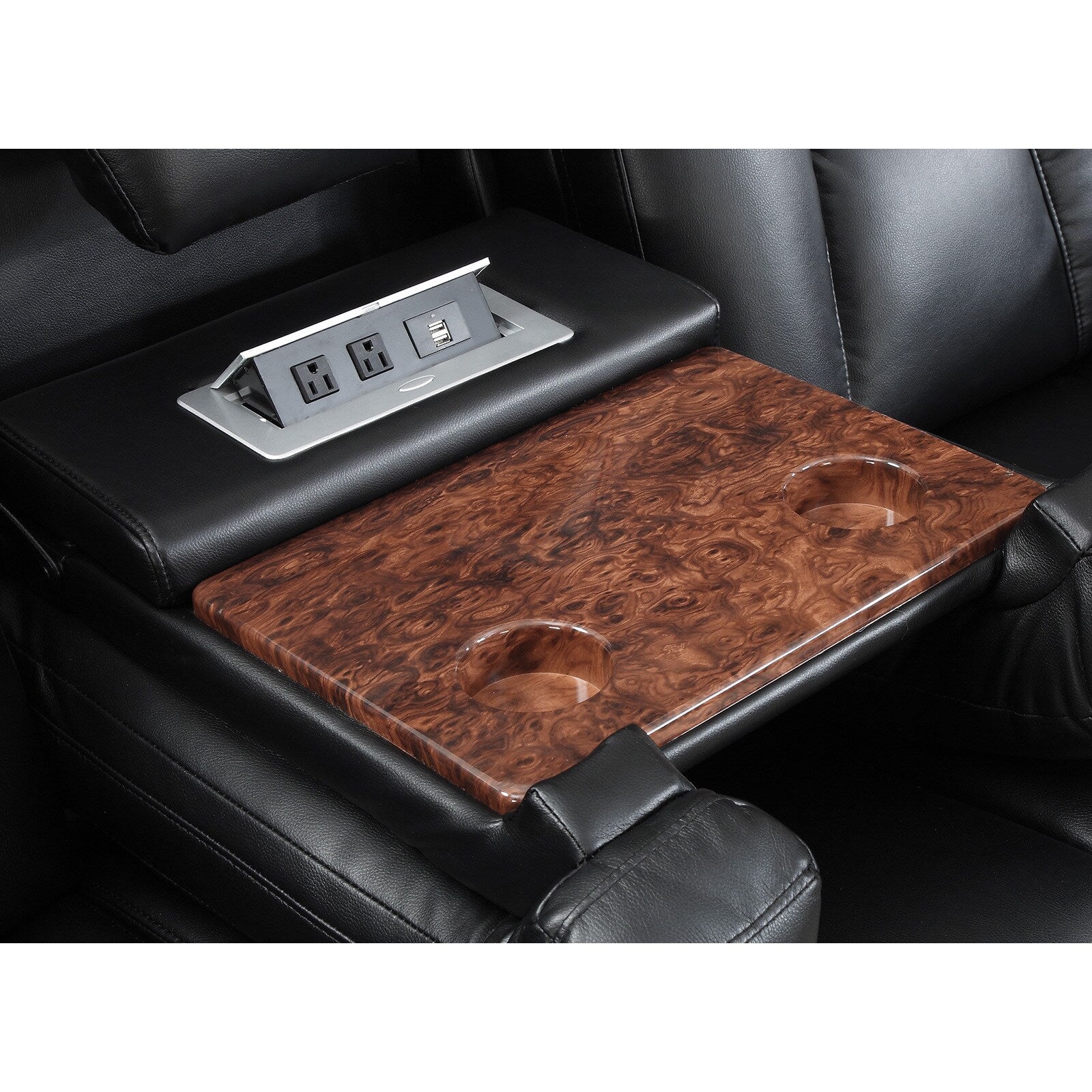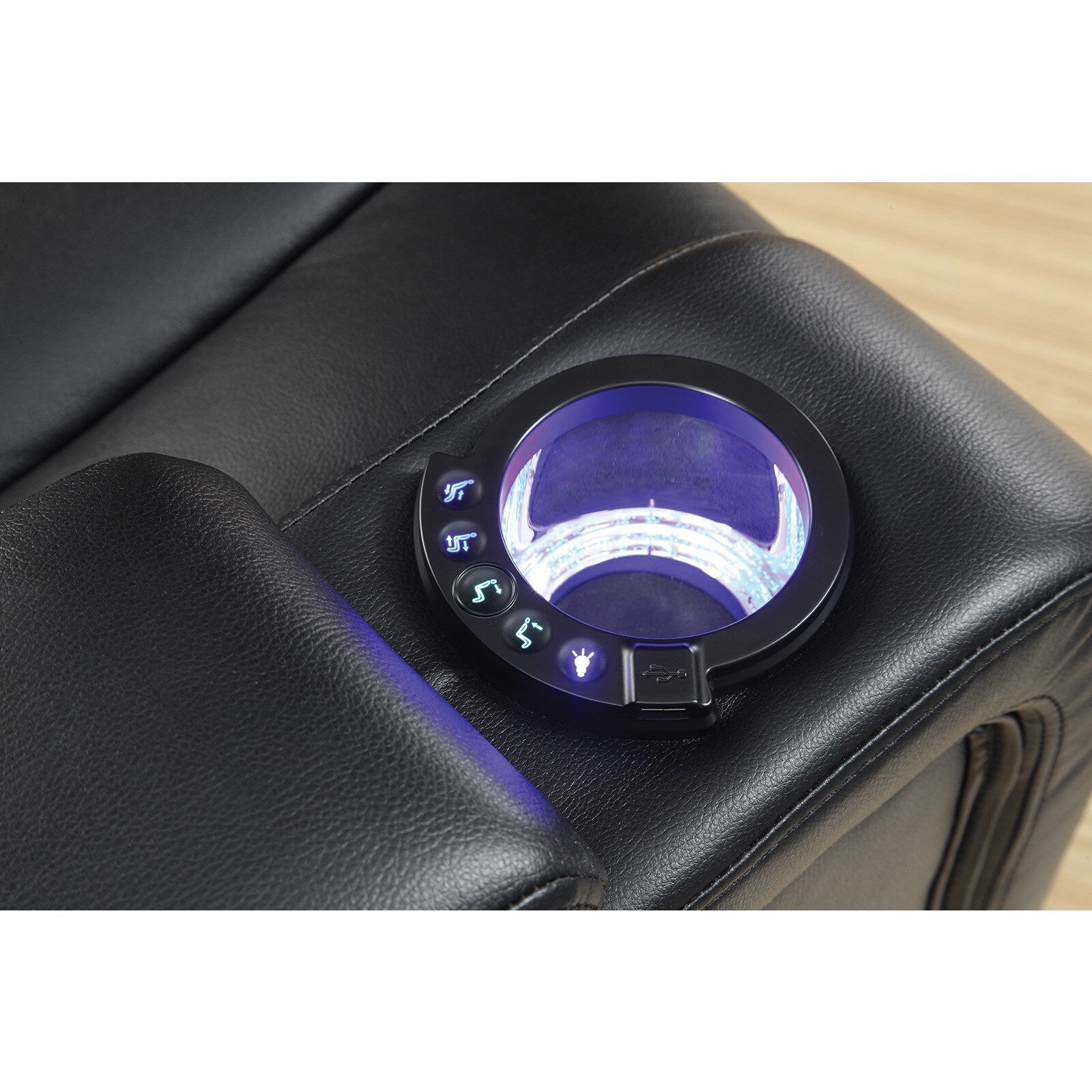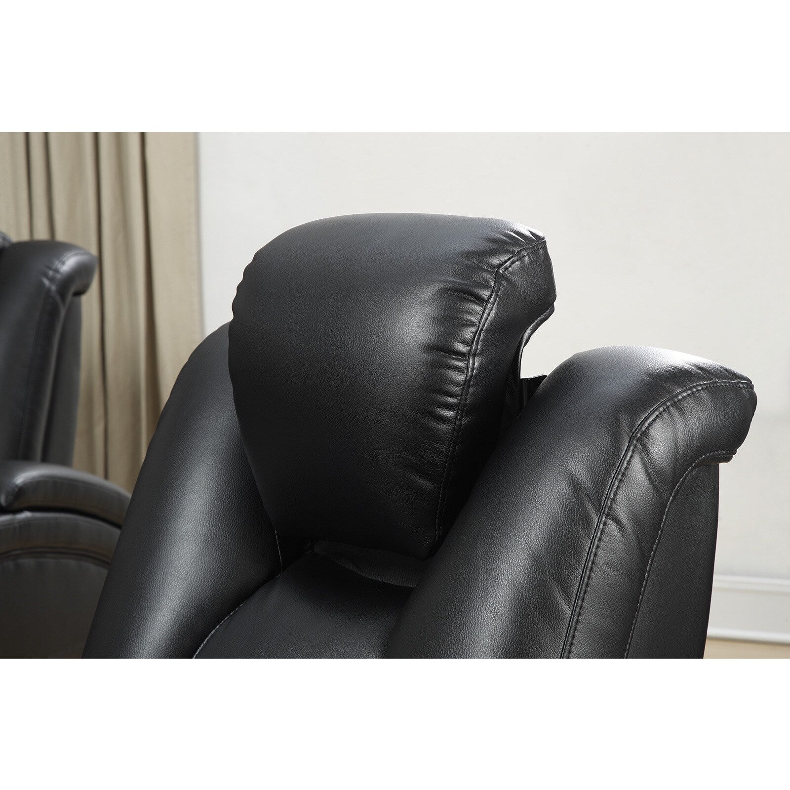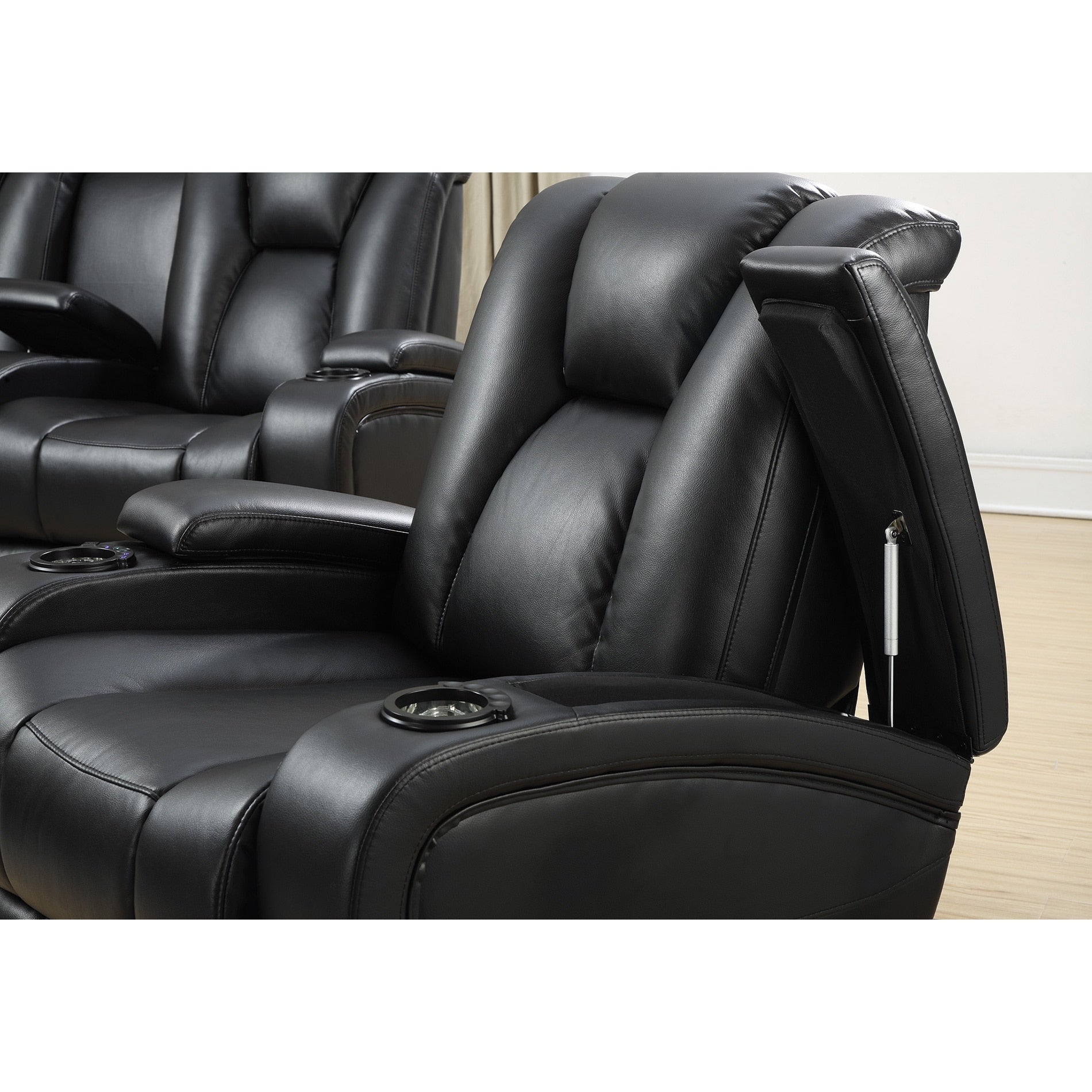 Ce canapé contemporain est recouvert de similicuir noir capitonné et intègre de nombreux accessoires pour un séjour luxueux. Ce fauteuil inclinable de luxe dispose de rangements intégrés aux accoudoirs, d'une assise en forme de cuillère, d'appuie-têtes électriques, d'un éclairage LED dissimulé dans l'appuie-tête central et d'un dossier rabattable avec porte-gobelets (version 3 places uniquement). Les porte-gobelets lumineux accueillent les commandes tactiles de tous les mécanismes, et des ports USB intégrés permettent de recharger facilement vos appareils.