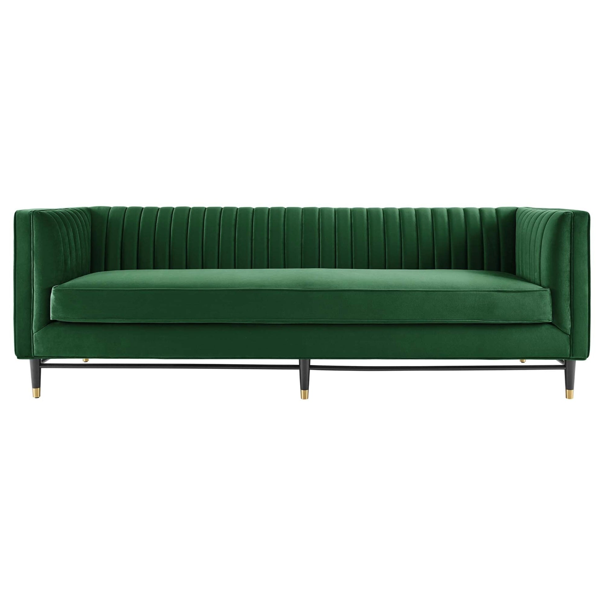Intégrez les lignes fluides du canapé Devote en velours haute performance capitonné à canaux dans votre salon, votre chambre ou votre bureau. Apportant une touche rétro au capitonnage classique, ce canapé est rehaussé d'un capitonnage à canaux verticaux qui ajoute de la profondeur visuelle et une touche glamour à tout espace. Revêtu de velours haute performance antitache et rembourré de mousse dense, ce canapé de salon offre une assise haut de gamme. De fabrication durable, il repose sur des pieds en hévéa noir avec des manchons en acier inoxydable doré qui lui confèrent une touche subtile. Embouts non marquants inclus. Assemblage requis. Capacité de charge du canapé : 600 kg.