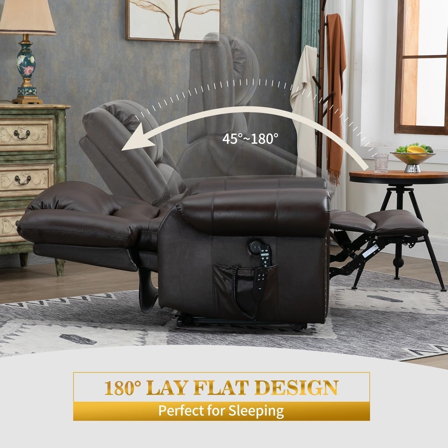 Vous pouvez actionner la télécommande pour contrôler la montée ou la descente du fauteuil inclinable, vous permettant ainsi d'obtenir la position souhaitée, qu'elle soit inclinée à 180 degrés ou relevable. Grâce à un mécanisme électrique à double moteur, le fauteuil releveur peut se relever entièrement et fonctionner en douceur et en silence pour aider les personnes âgées à se lever facilement. Il est également idéal pour les personnes souffrant de problèmes d'équilibre aux jambes ou au dos, ou qui viennent de subir une intervention chirurgicale.