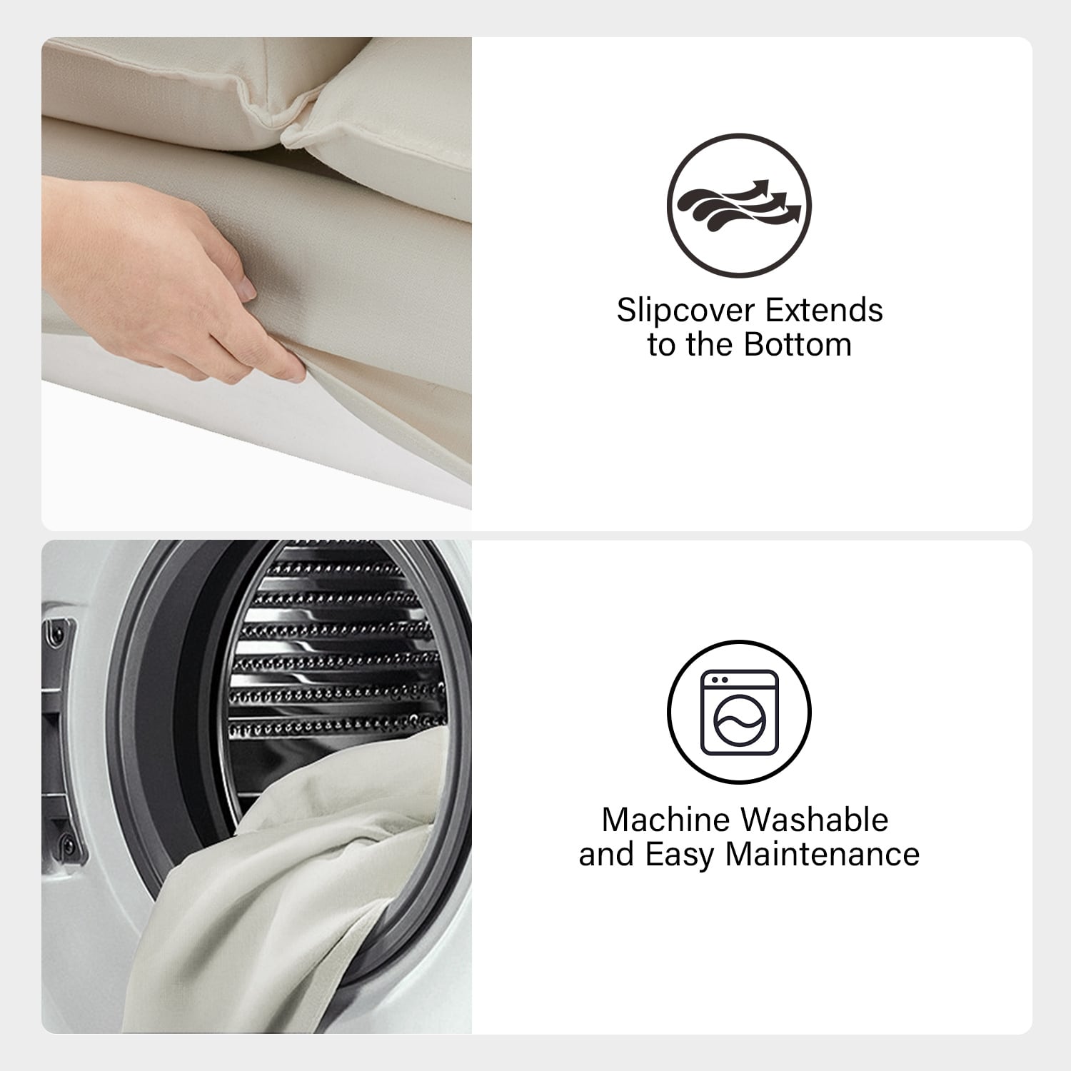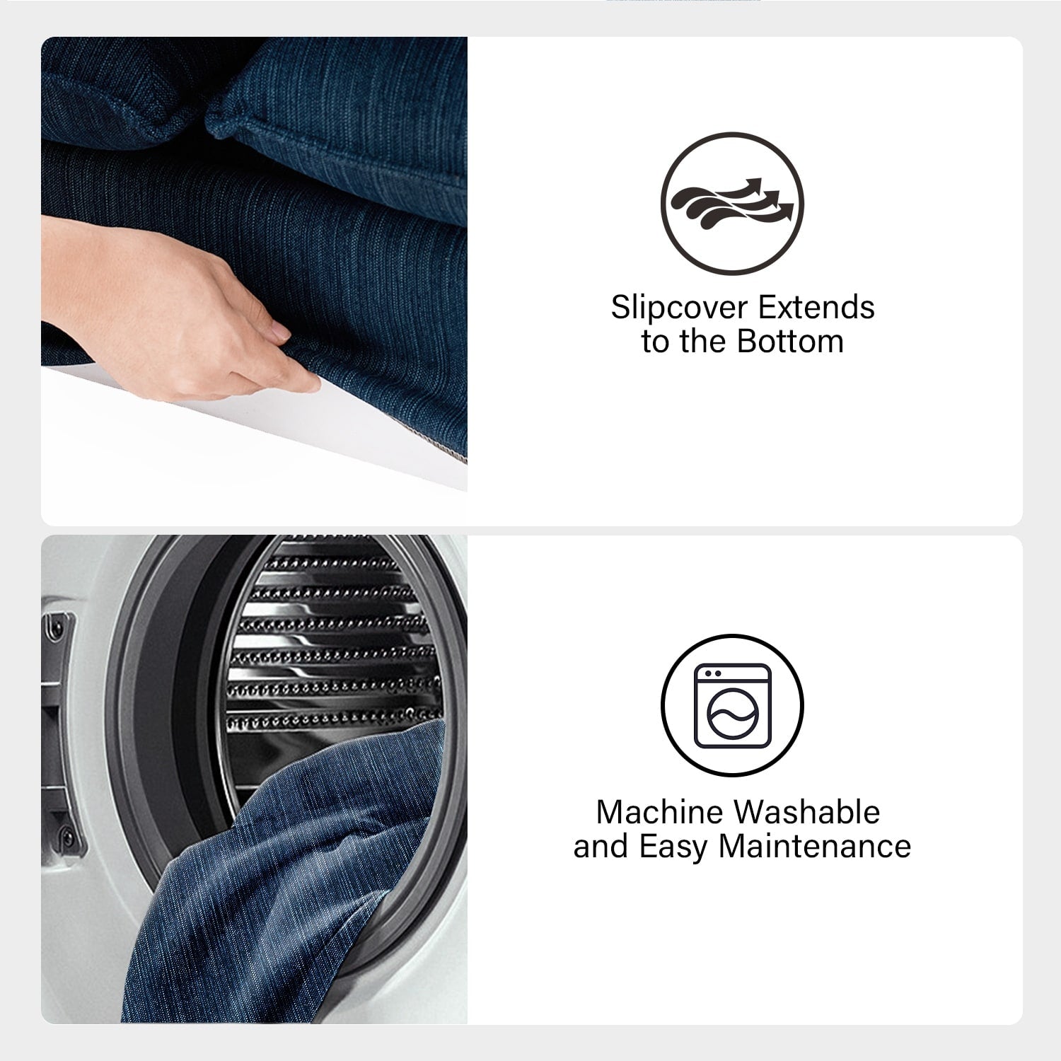 - Housses amovibles et lavables en machine : Pratiques, les housses amovibles facilitent l'entretien et le nettoyage. Dézippez simplement les housses, retirez-les et mettez-les en machine pour un canapé toujours frais et accueillant.
