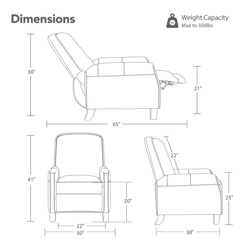 Offrez-vous un confort luxueux avec le fauteuil inclinable à dossier rabattable Elias. Sa finition cloutée chic et sa fabrication robuste ajoutent style et durabilité à tout espace de vie. Profitez d'un réglage facile sur trois positions, idéal pour lire, regarder la télévision ou faire la sieste. Revêtu de similicuir facile d'entretien, ce fauteuil inclinable réglable offre l'aspect et le toucher du cuir véritable avec une texture douce comme du beurre. Idéal pour les adultes en quête de détente élégante dans leur salon ou leur home cinéma, le fauteuil inclinable à dossier rabattable Elias allie élégance et fonctionnalité.