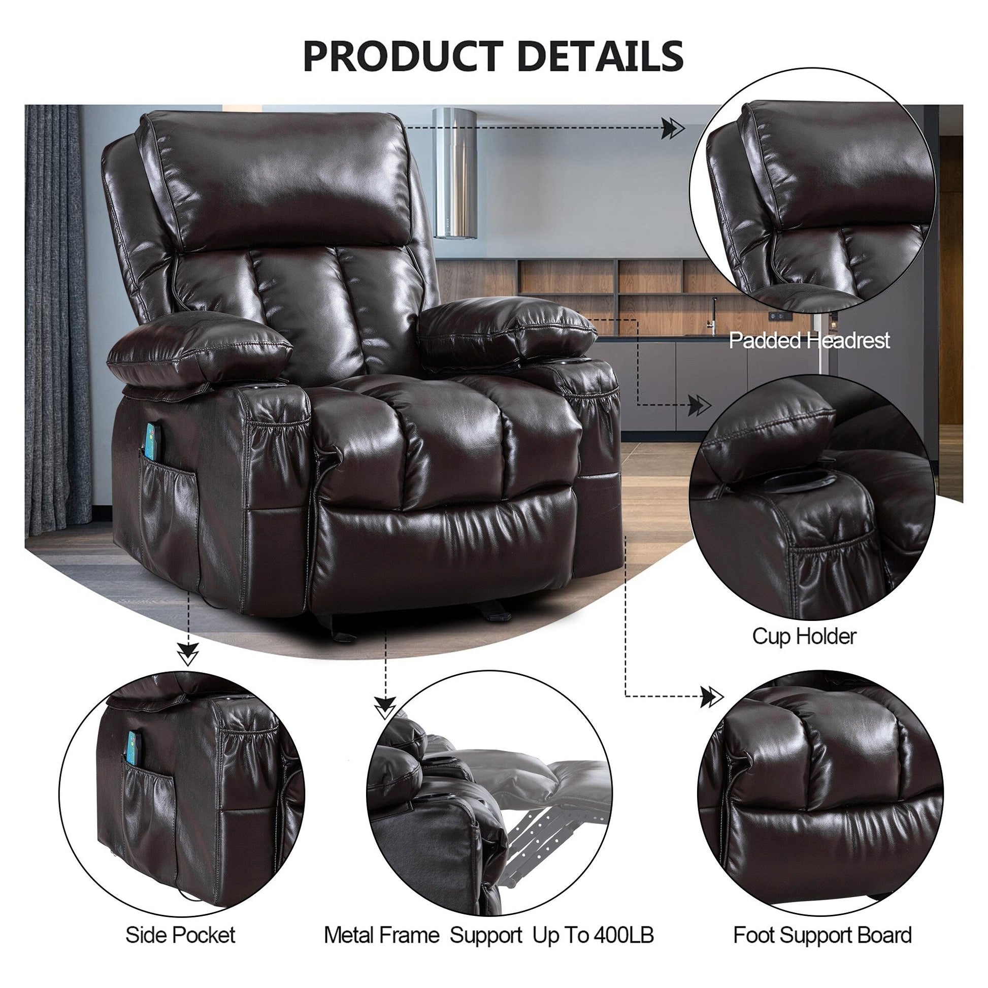 Revêtement durable : le cuir respirant et doux pour la peau améliore le toucher. Ce fauteuil inclinable à bascule est garni d'une éponge suffisamment épaisse pour offrir un soutien dorsal et lombaire optimal. Sa structure intérieure en bois de haute qualité et son cadre inférieur en métal robuste garantissent la sécurité de l'utilisateur et prolongent sa durée de vie.