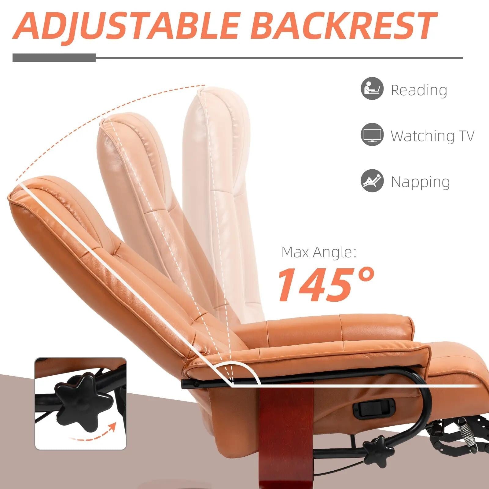 - Dossier inclinable : ajustez la position de votre fauteuil inclinable pivotant selon vos préférences, en l'inclinant jusqu'à un angle maximum de 145°.