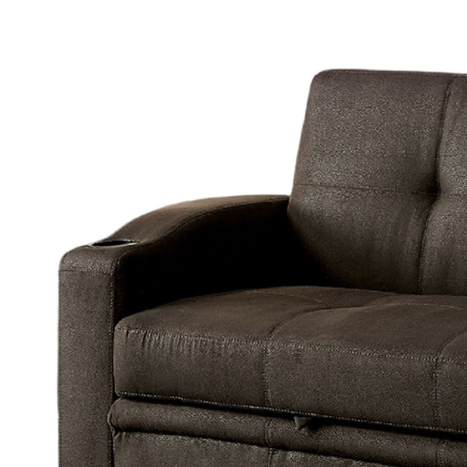 Optimisez votre espace avec ce canapé futon convertible polyvalent. Sa structure en bois massif et son revêtement en tissu marron foncé offrent durabilité et confort, tandis que le capitonnage à boutons ajoute une touche d'élégance. Transformez-le facilement en lit ou en méridienne double grâce à la base coulissante sous l'assise. Ses porte-gobelets intégrés et ses poches latérales améliorent sa fonctionnalité, ce qui en fait un complément idéal.