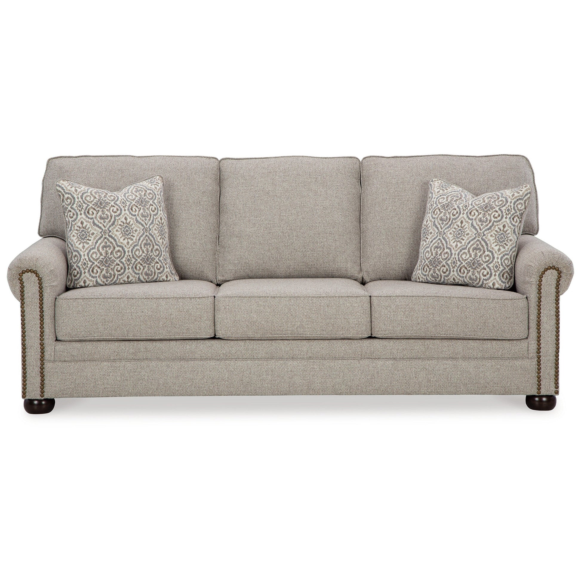 Canapé Gael, polyester gris beige, garniture cloutée marron foncé, 220 cm