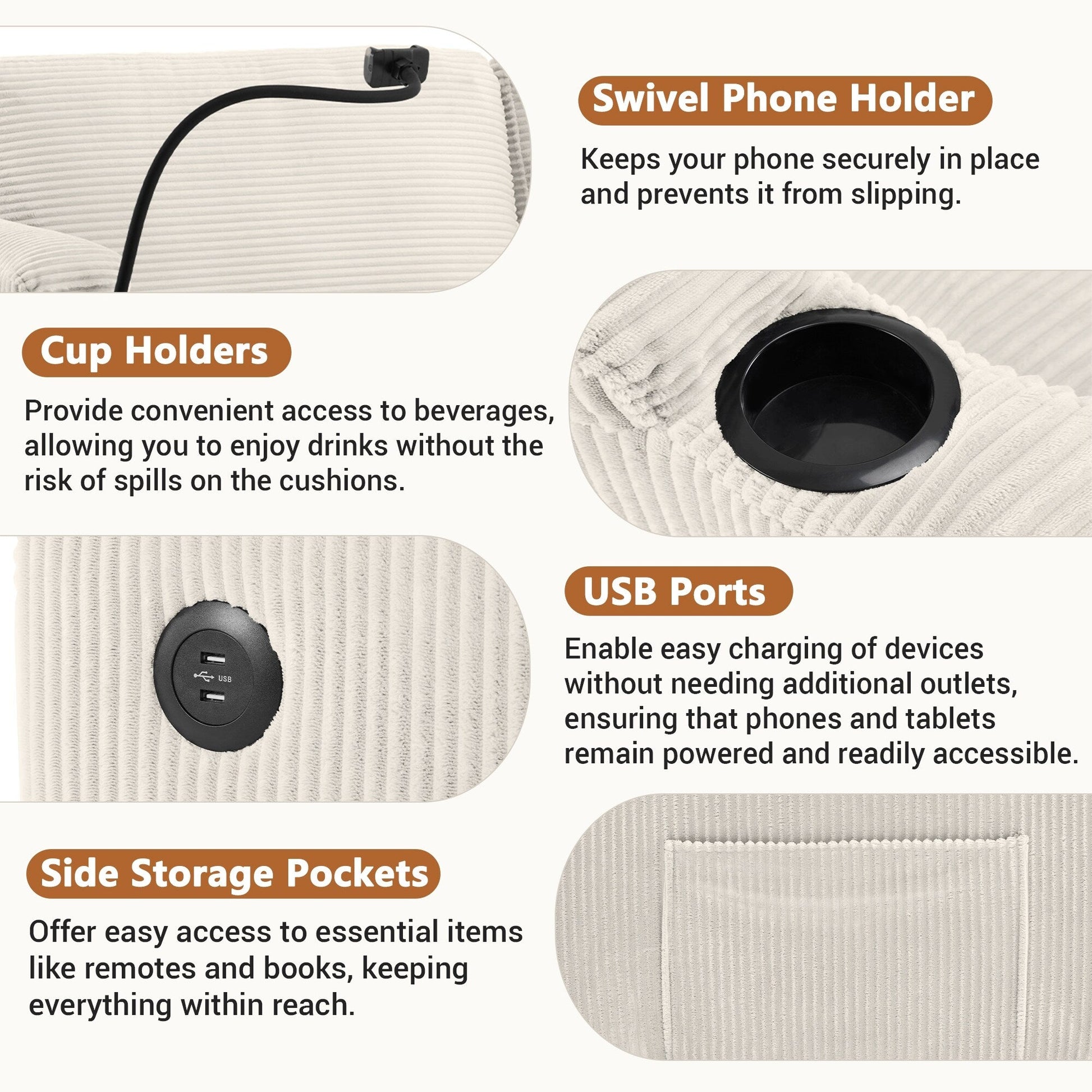 Porte-gobelets intégrés : deux porte-gobelets intégrés dans les accoudoirs vous permettent de déguster des boissons tout en vous relaxant, en gardant les boissons en sécurité et en minimisant les déversements sur les coussins.