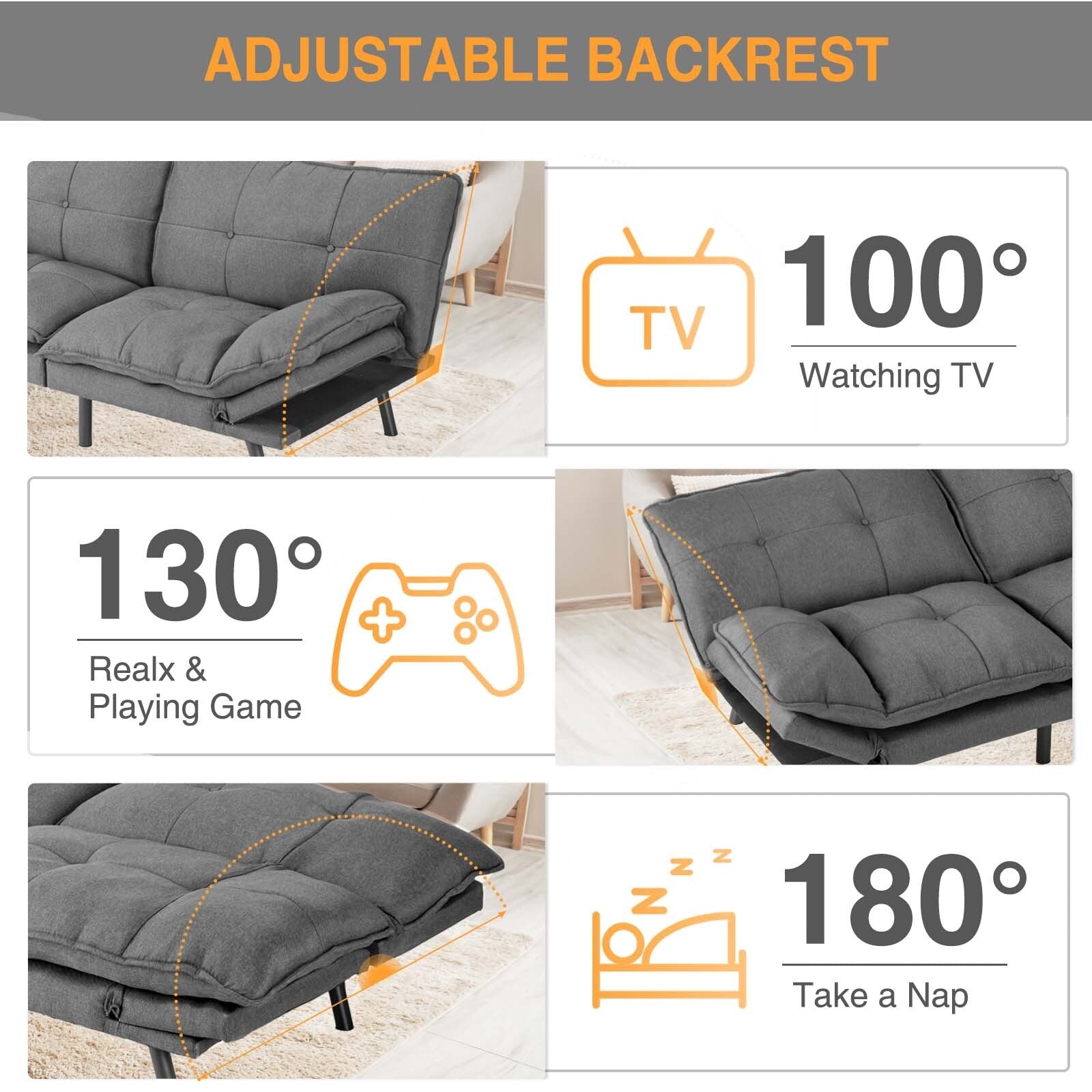 - Canapé-lit réglable en hauteur : Profitez d'un confort et d'une flexibilité optimaux grâce à notre canapé-lit réglable. Le dossier offre trois angles d'inclinaison (120°/160°/180°), tandis que l'accoudoir est également réglable en hauteur. Personnalisez votre position assise et votre position de couchage pour un confort personnalisé.