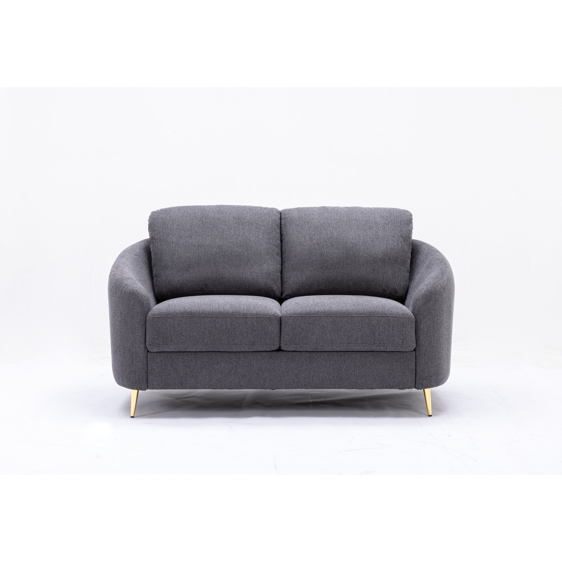 Canapé causeuse en lin gris avec pieds en métal doré et coussins d'assise moelleux