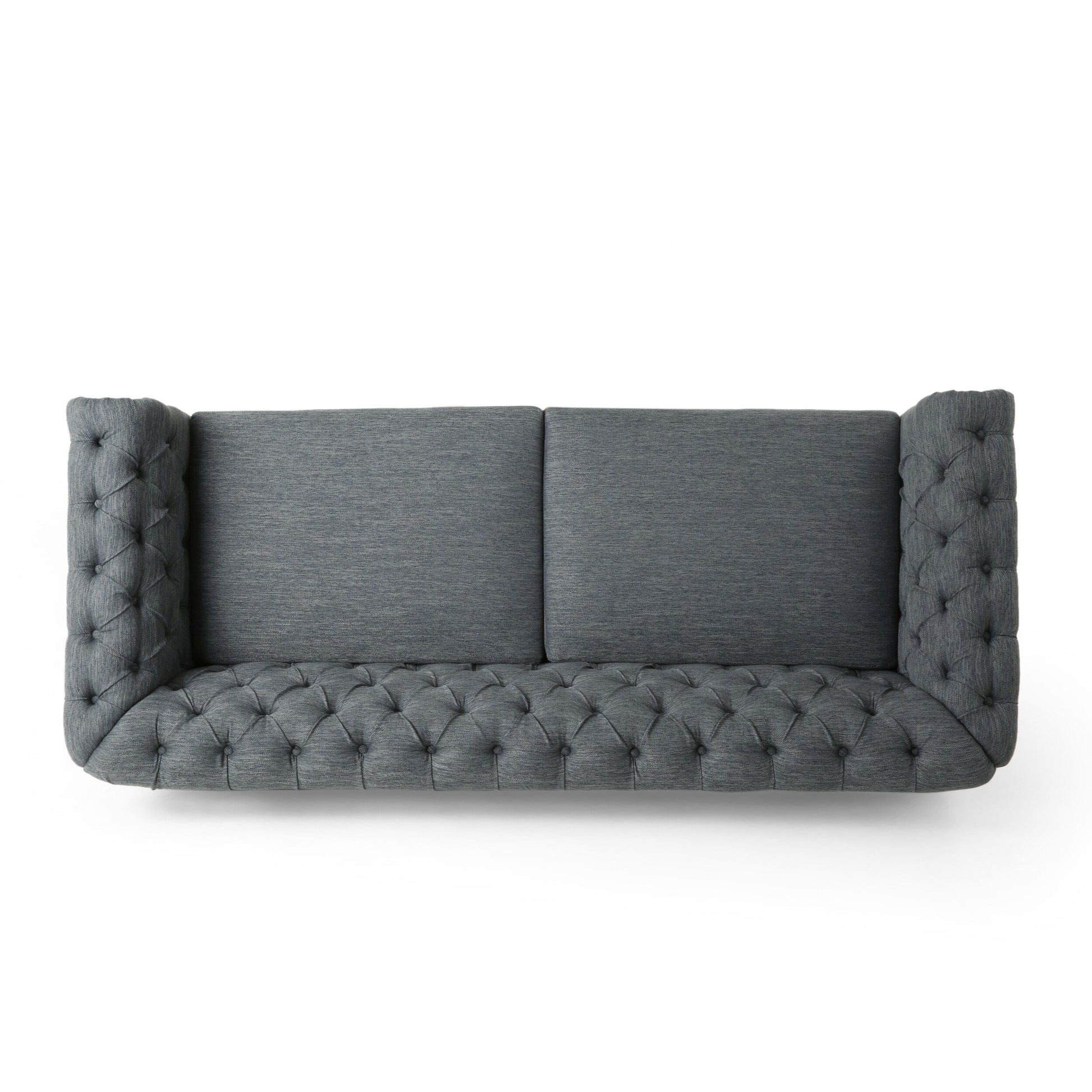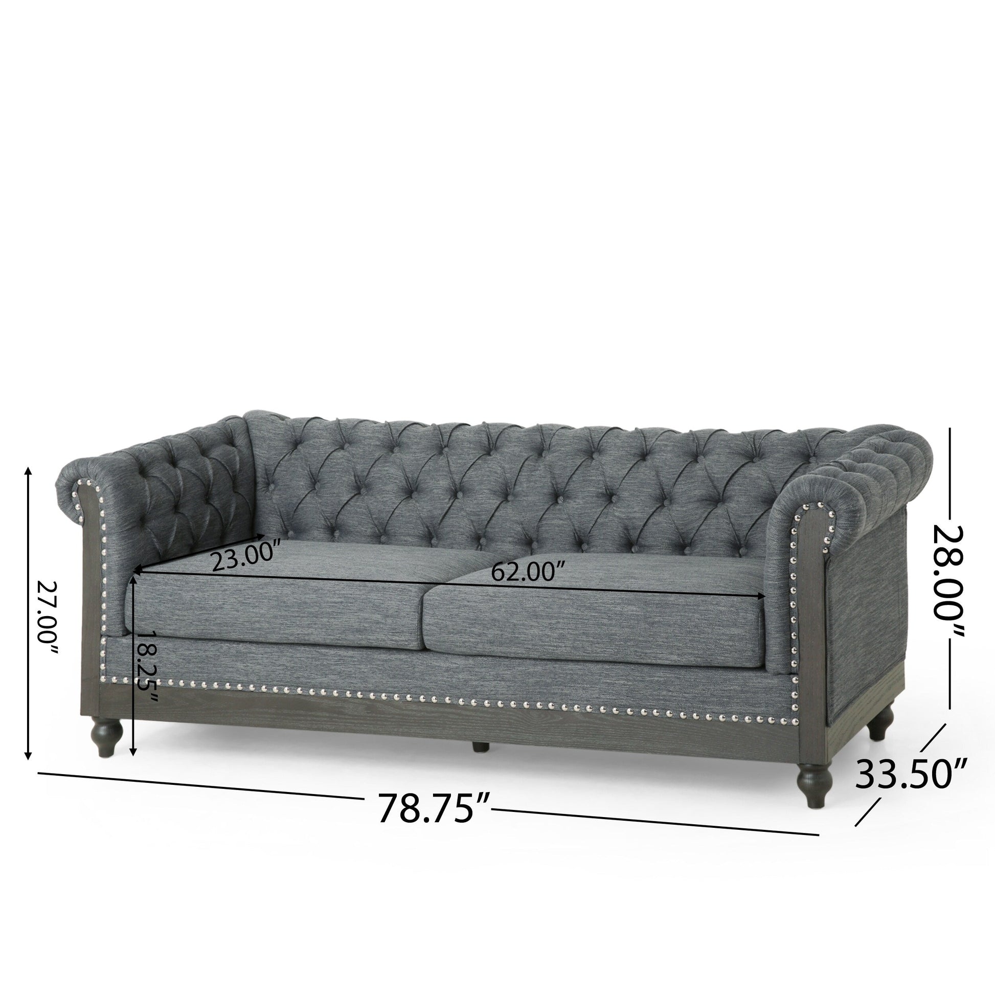 Canapé 3 places en tissu gris 78,75 avec pieds en bois, détails rivetés et dossier à tirette