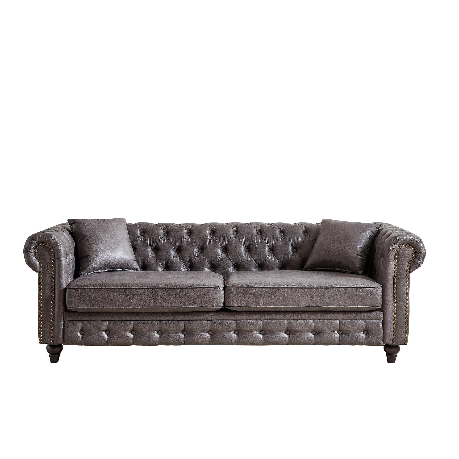 Canapé Chesterfield 3 places en tissu technique gris 85,5 avec accoudoirs roulés et 2 coussins pour le salon