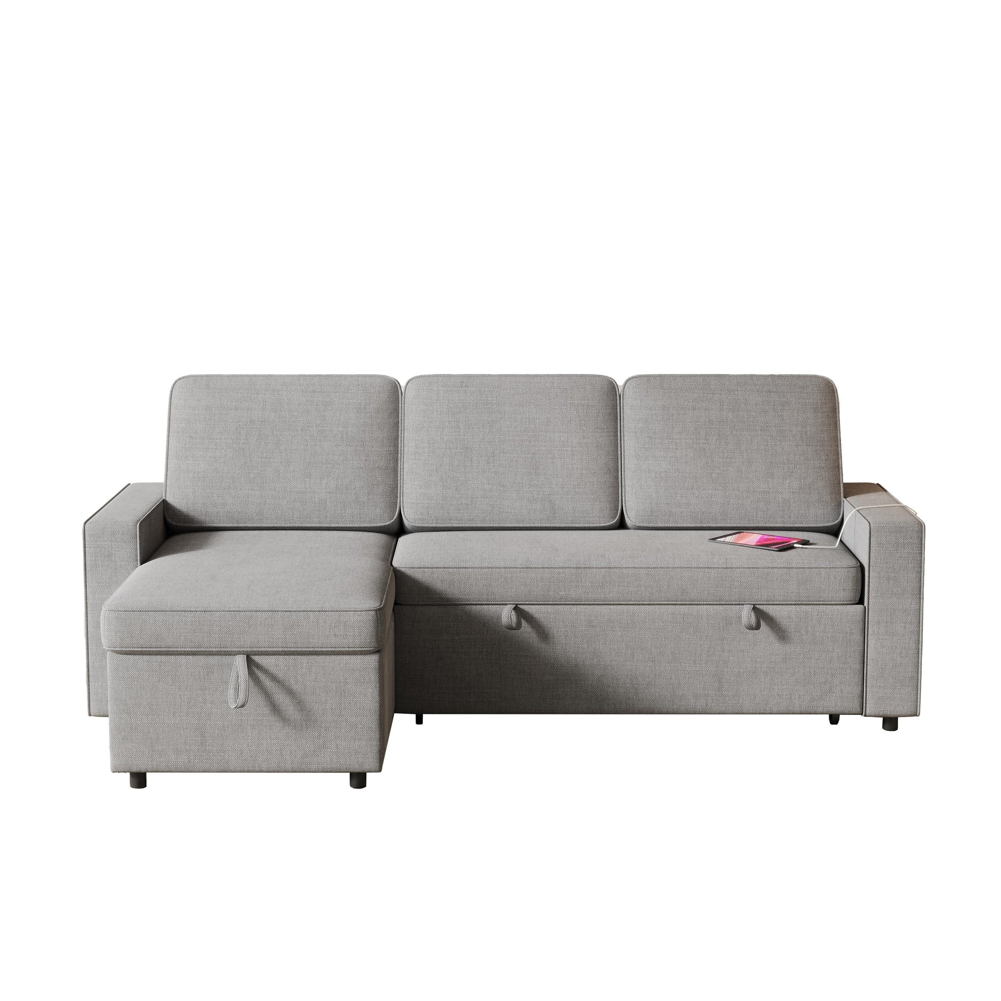 Canapé-lit en L en tissu gris de 217 cm avec méridienne de rangement, ports USB, lit gigogne et étagères de rangement