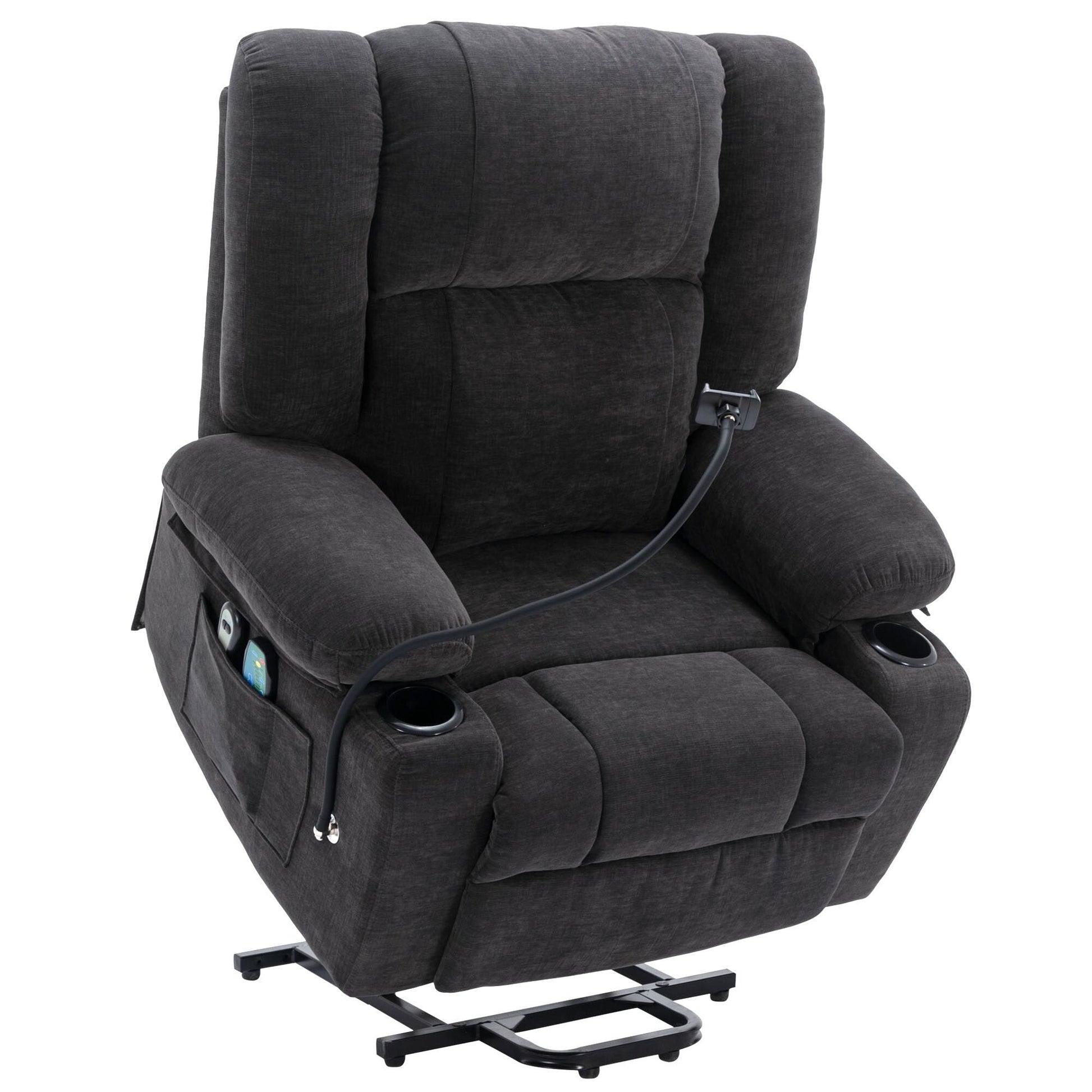 Fauteuil inclinable électrique gris avec massage, chauffage, porte-gobelets et support de téléphone pivotant à 360°, options d'inclinaison réglables