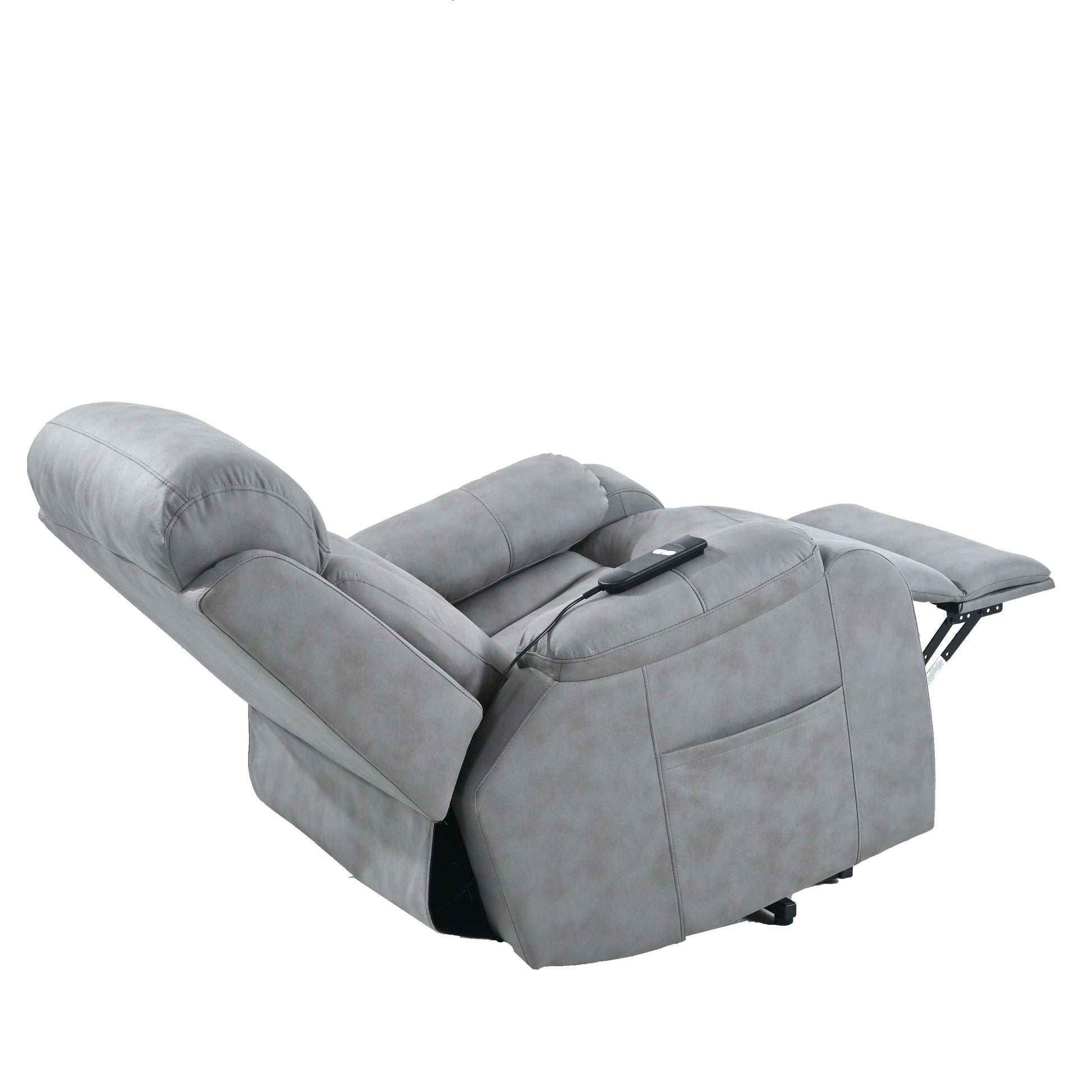 Fauteuil inclinable électrique en tissu gris pour personnes âgées, avec télécommande, coussin rembourré, poche latérale et cadre robuste.