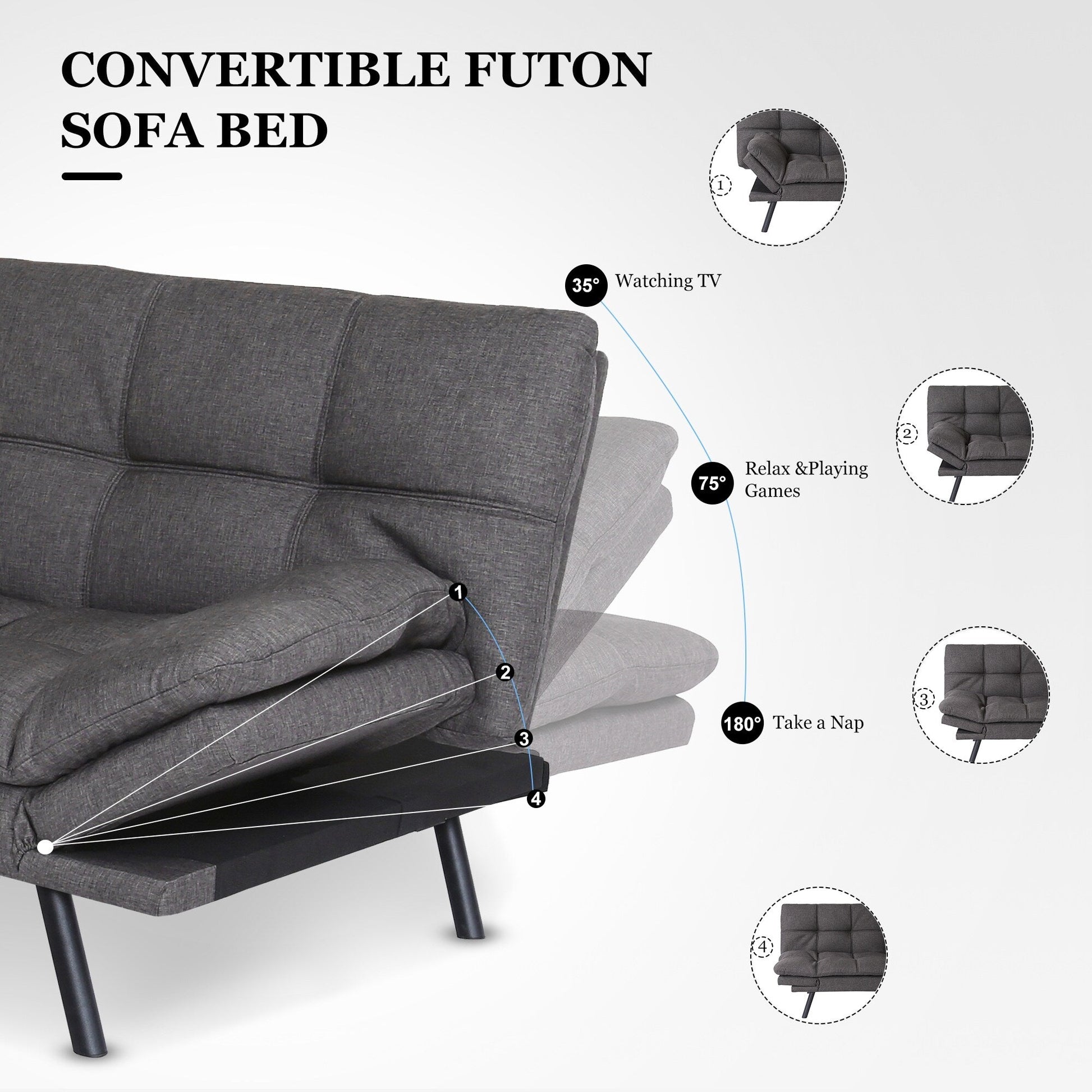 - Le canapé-lit futon est doté d'accoudoirs et d'un dossier réglables et flexibles. Vous pouvez ainsi personnaliser votre confort et trouver la position idéale pour vous asseoir, lire, regarder la télévision ou faire une sieste. Il peut également servir d'accoudoir, d'oreiller, de repose-pieds ou de couchage, offrant ainsi une infinité de possibilités de détente.