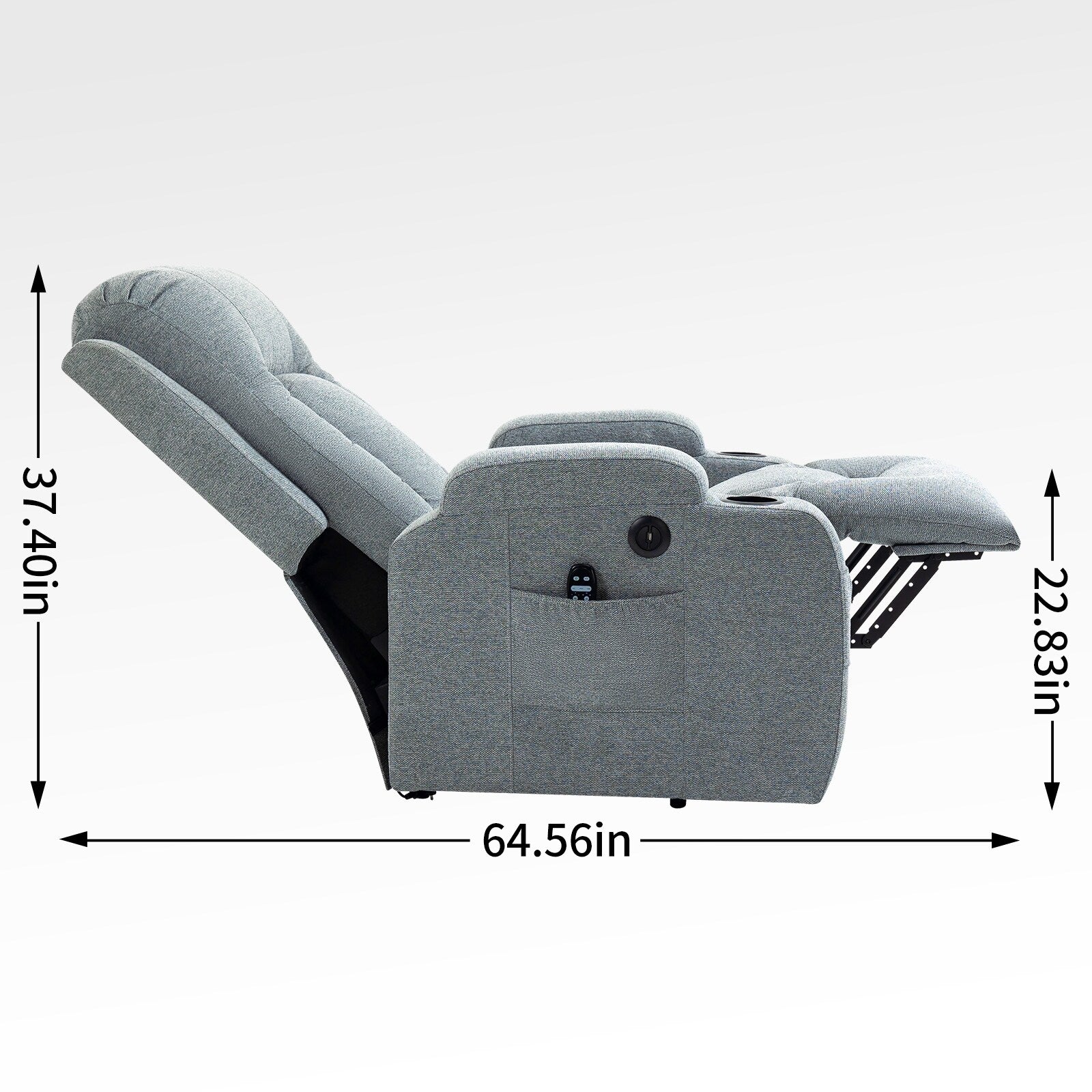 Fauteuil inclinable électrique gris avec massage, chauffage, port USB, soutien lombaire, deux porte-gobelets et poches latérales
