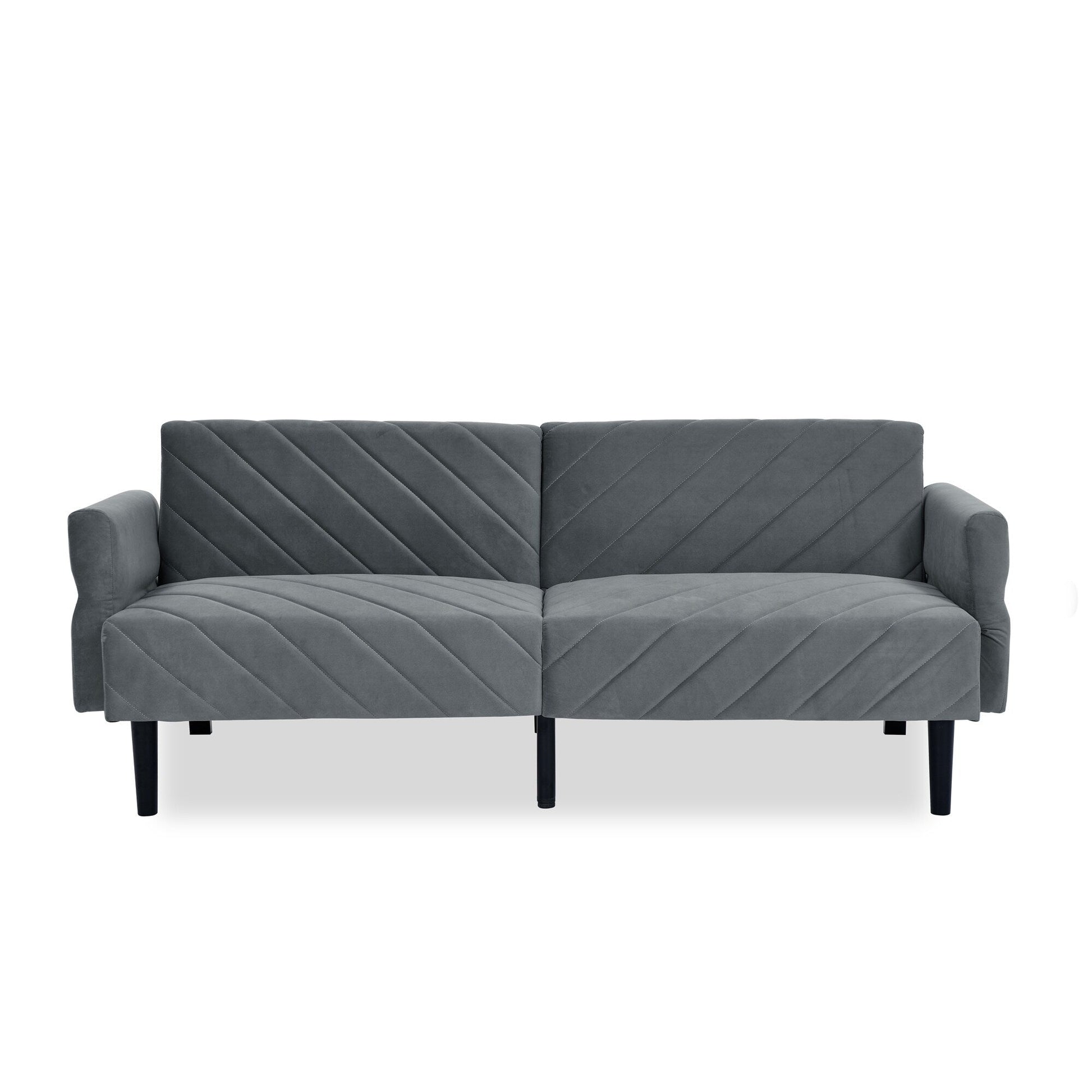 Sublimez votre espace de vie avec ce canapé-lit futon en velours, intemporel et polyvalent. Alliant lignes modernes et détails modernes du milieu du siècle, comme le capitonnage à chevrons et les pieds fuselés en plastique, ce meuble apporte une touche d'élégance à tout décor. Le revêtement en velours est non seulement élégant, mais offre également un confort et une durabilité accrus, vous permettant de profiter de sa douceur et de sa chaleur. Les accoudoirs et dossiers réglables multi-angles offrent un confort personnalisé, avec un dossier inclinable sur 6 positions (de 90° à 180°), idéal pour lire, se divertir ou dormir. Il suffit de tirer pour le transformer en canapé, lit ou fauteuil inclinable. Conçu pour une utilisation durable, le cadre en fer et bois massif assure une structure stable, tandis que la mousse haute densité offre un soutien ferme et confortable qui ne se déforme pas. Les accoudoirs réglables offrent un espace de couchage plus grand, vous permettant de vous allonger confortablement sur le canapé-lit au lieu de vous y blottir. Le couchage mesure 260 x 110 x 550 cm, offrant un espace de détente généreux.