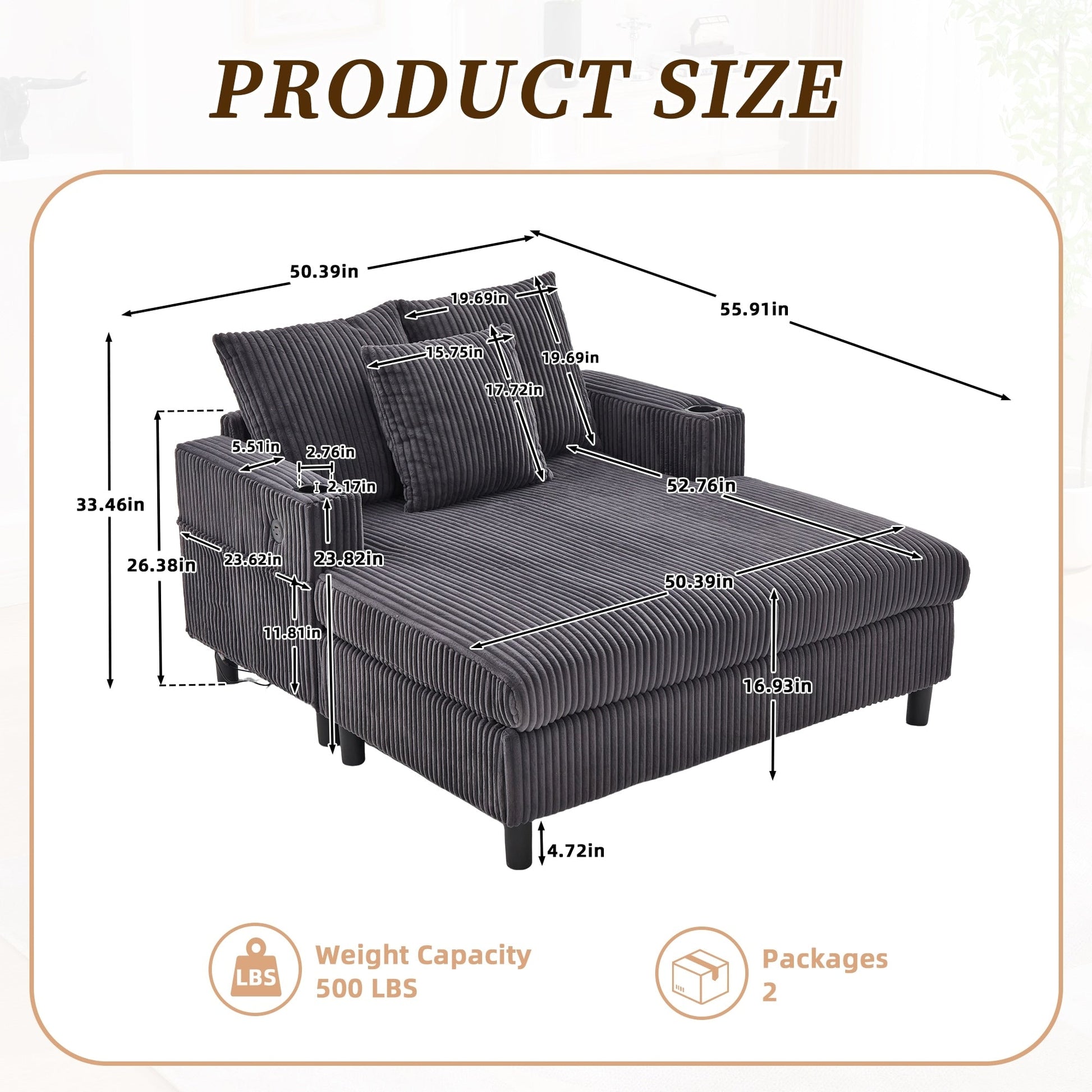 - 1*USB(5V-2.4A)+1*Type-c(5V-2.4A) Ports Type-C et USB pratiques : le canapé est doté d'un port de charge 1×USB (5V-2.4A) + 1×Type-C (5V-2.4A) intégré, qui peut être chargé à tout moment, faisant du canapé la « station d'alimentation en énergie » dans le salon, afin que vous puissiez rattraper le drame et le travail de bureau sans perdre de puissance, et profiter du confort et de la commodité en une seule étape !