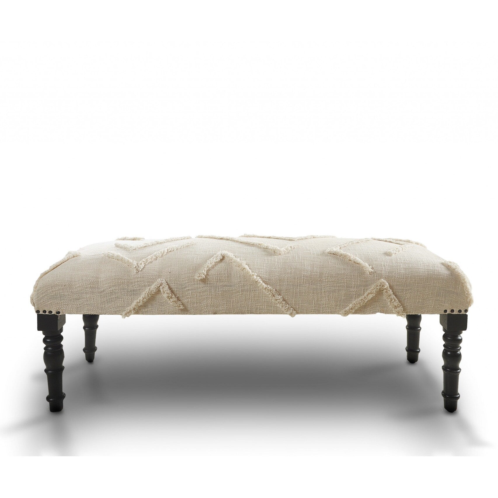Banc rembourré de style bohème avec pieds en bois foncé et motif abstrait brodé en crème ivoire texturé.