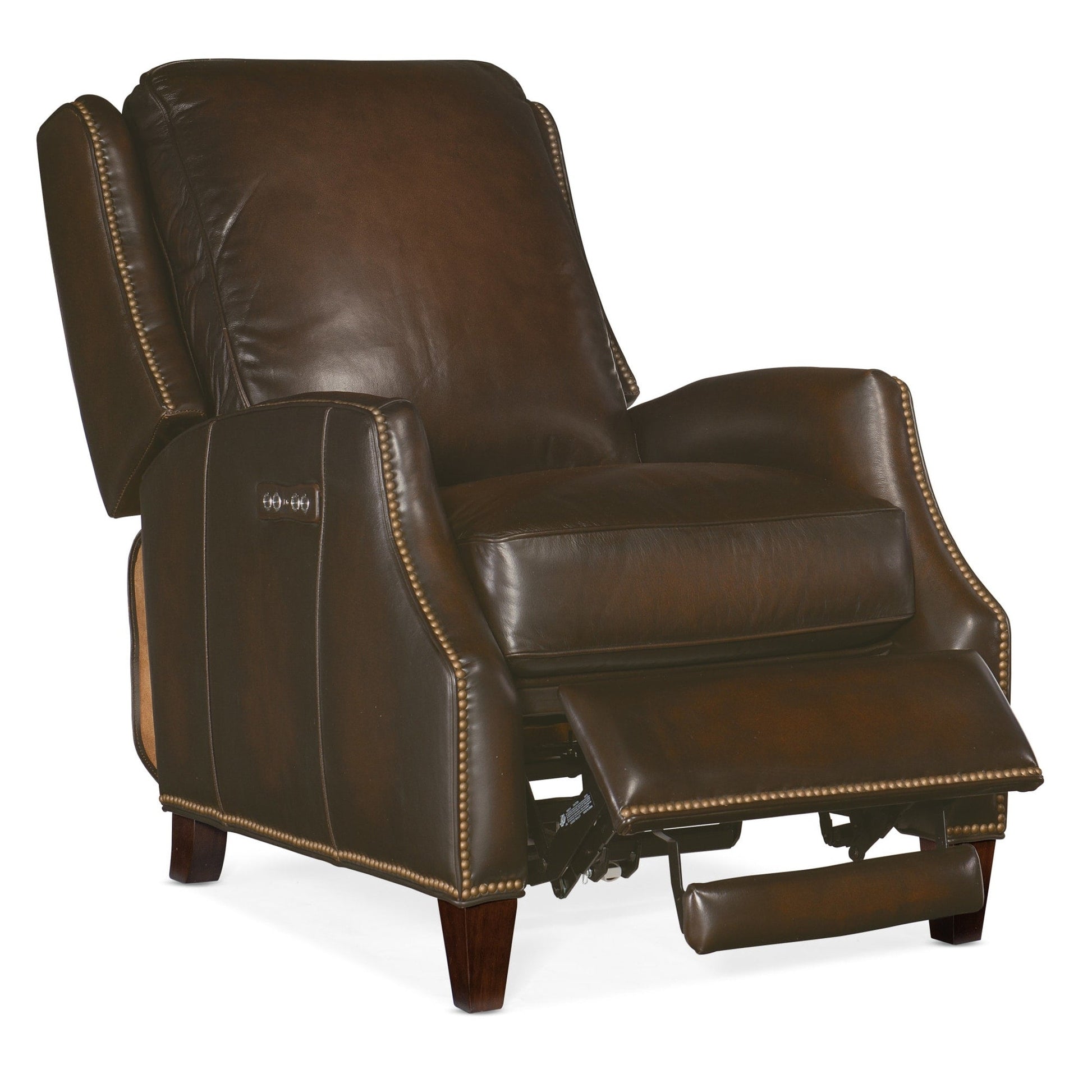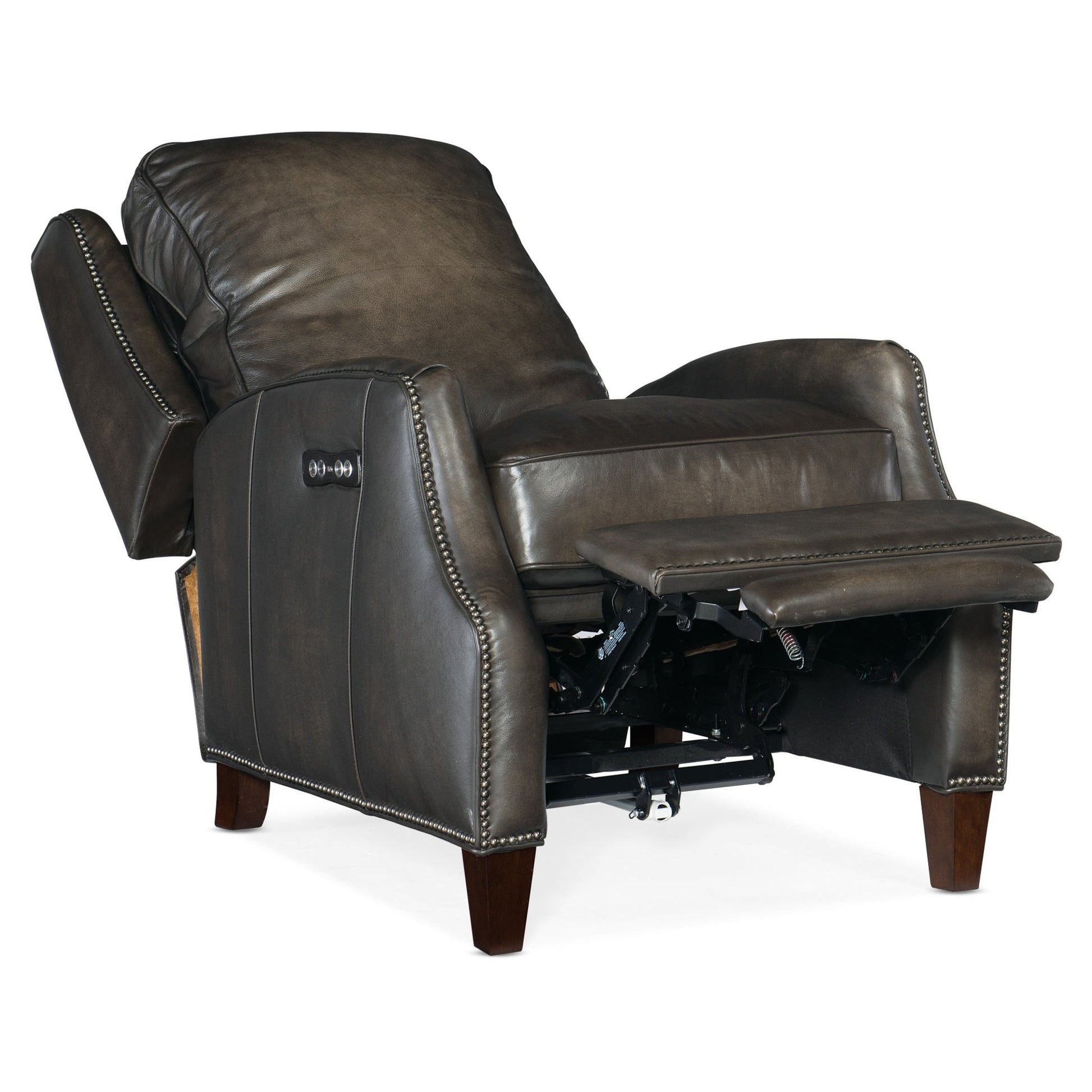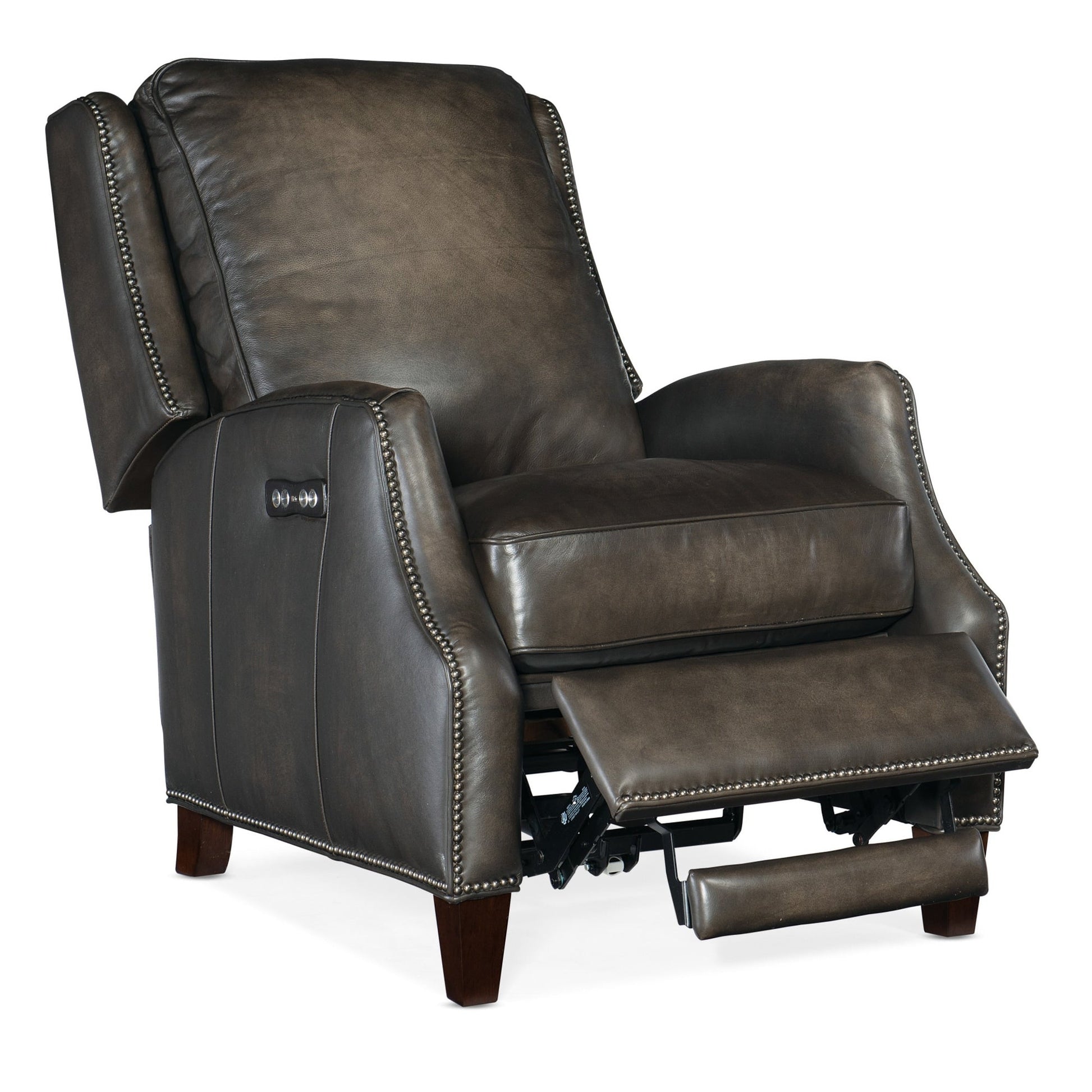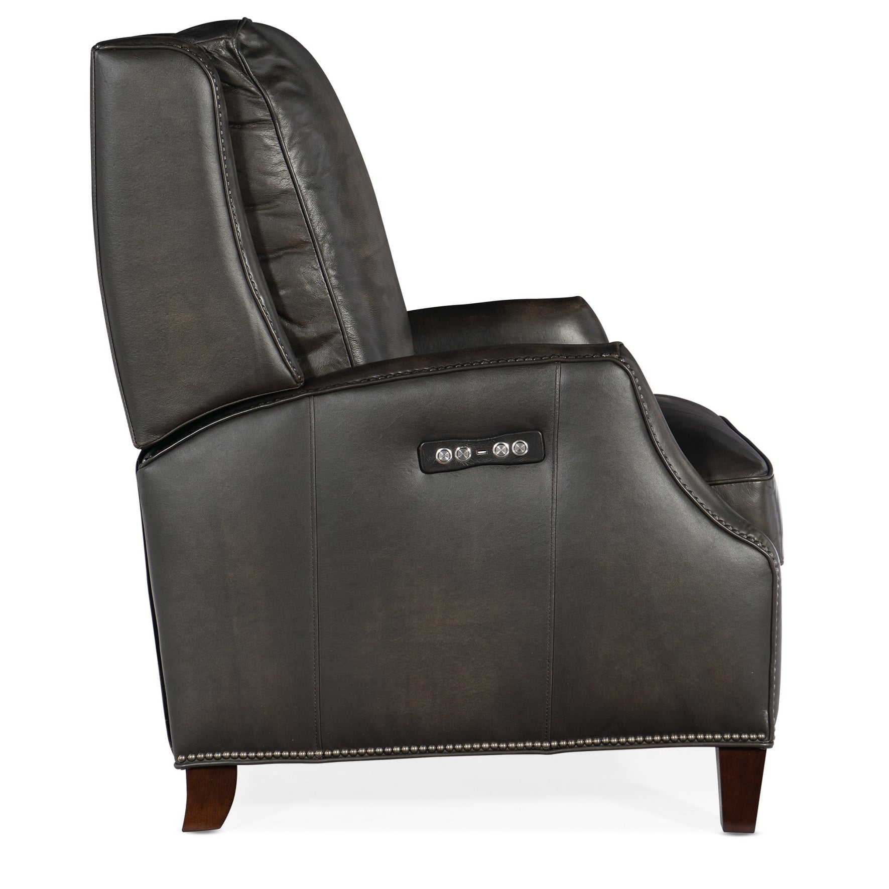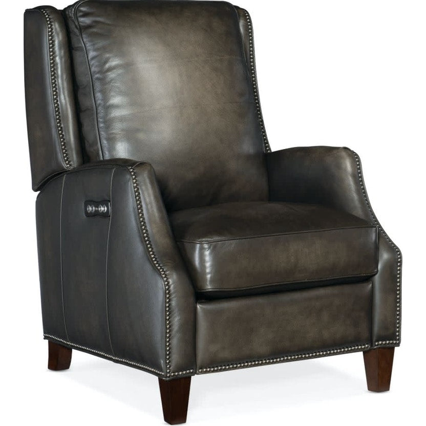 Sur mesure et intemporel, le fauteuil inclinable électrique Kerley est un classique décontracté instantané. Doté d'une inclinaison et d'un appui-tête électriques, le Kerley est recouvert d'un luxueux cuir pleine fleur avec des garnitures cloutées autour des accoudoirs, de la base et des côtés, et ses pieds présentent une finition foncée.