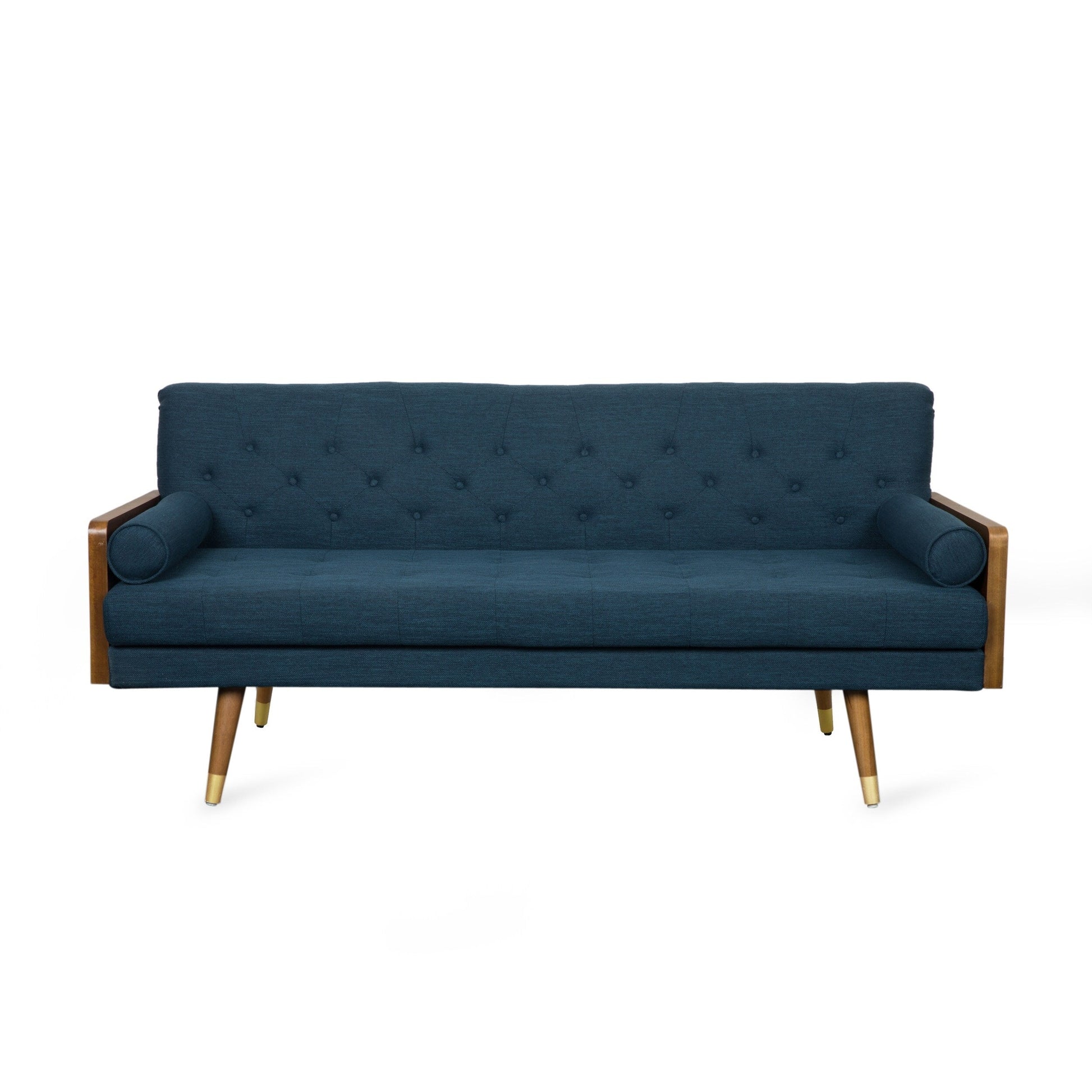 Sublimez votre salon avec le canapé Jalon en tissu capitonné, de style Mid-Century Modern, de Christopher Knight Home. Avec son charmant design Mid-Century, ce canapé allie harmonieusement bois et tissu, offrant un confort irréprochable et un style sophistiqué. Son dossier capitonné, orné de surpiqûres en losange et de surpiqûres gaufrées, crée un superbe ensemble, tandis que ses pieds évasés aux embouts dorés et ses coussins décoratifs roulés apportent la touche finale idéale. Disponible en blush clair ou bleu marine, ce canapé raffiné transformera n'importe quel intérieur en une œuvre d'art époustouflante.