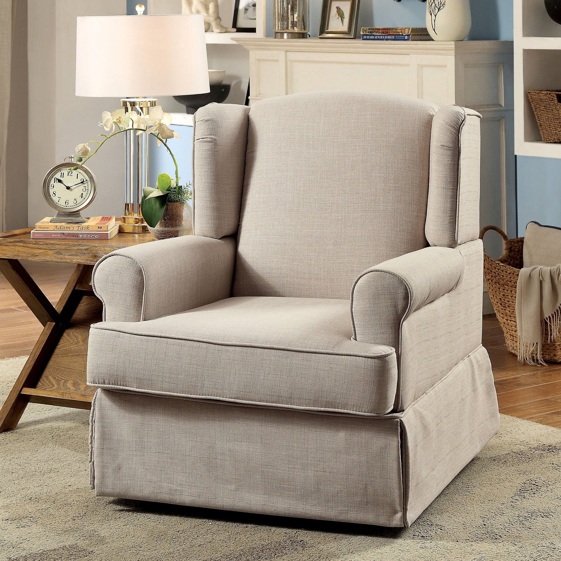 Détendez-vous confortablement et avec style dans ce fauteuil à bascule transitionnel à oreilles de Furniture of America. Son revêtement doux effet lin offre une sensation de fraîcheur et de tendance, tandis que son rembourrage en mousse offre un soutien optimal. Le pivot à 360 degrés vous permet de vous positionner confortablement pour regarder la télévision ou discuter avec vos invités sans vous lever. Avec ses accoudoirs arrondis, son dossier haut et sa jupe inférieure, ce fauteuil confère une touche chaleureuse à votre pièce, et ses deux coloris de tissu s'intègrent parfaitement à votre décoration. Ce fauteuil à bascule transitionnel de la collection Keal est idéal pour se blottir dans la chambre de bébé pour un moment de tranquillité avec bébé, ou pour lire confortablement dans le salon.