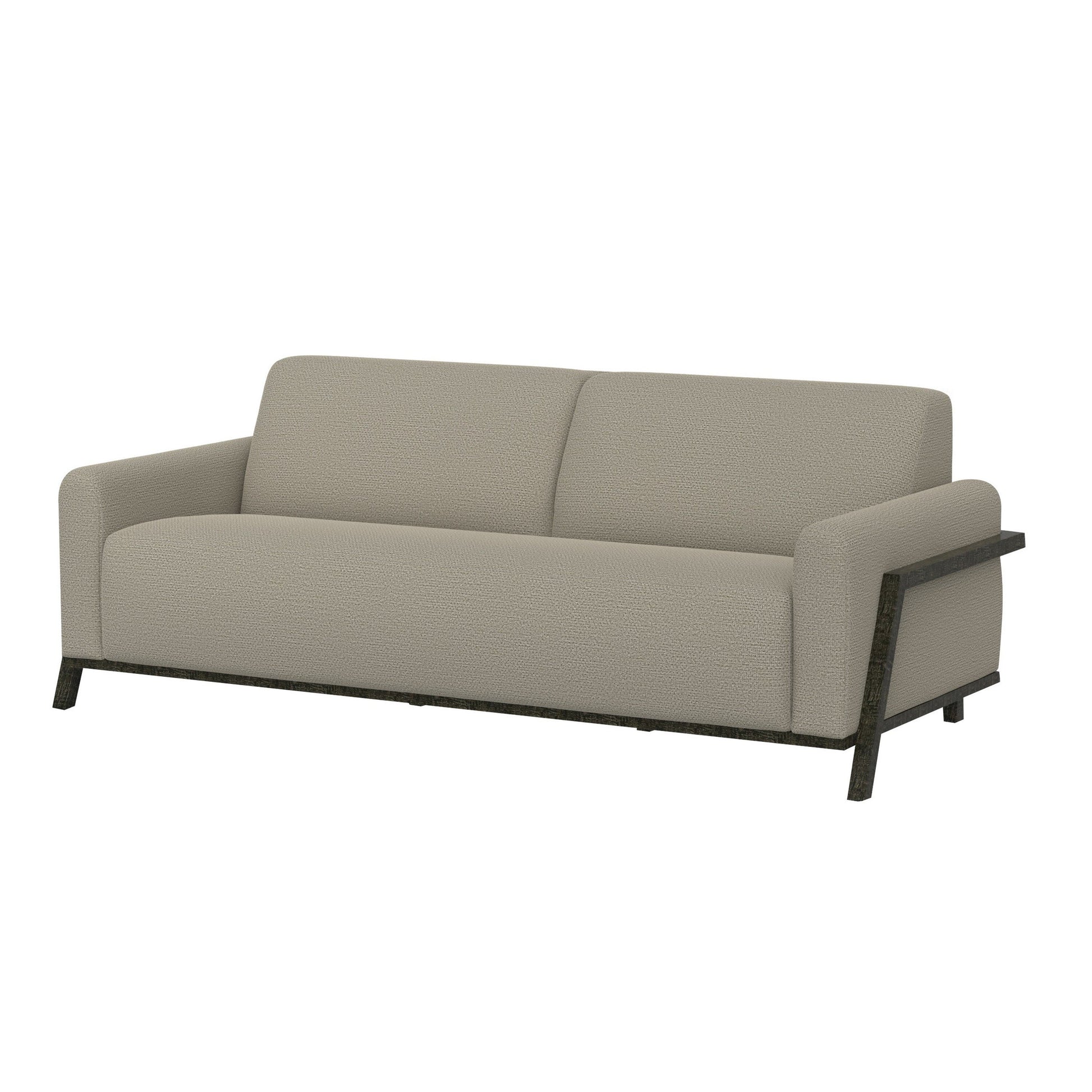 Canapé Kelly, polyester gris amande, 2 coussins décoratifs, bois massif, 230 cm