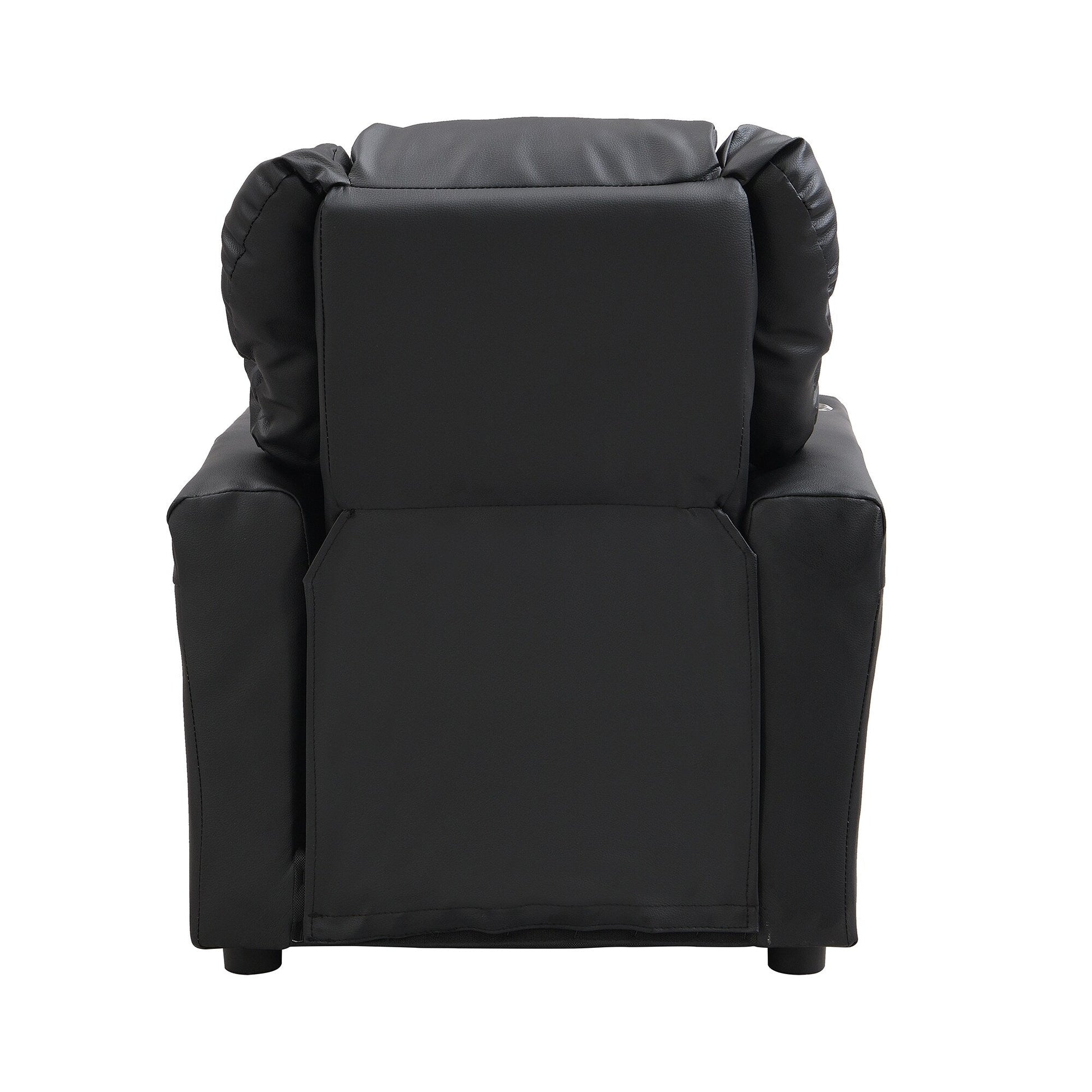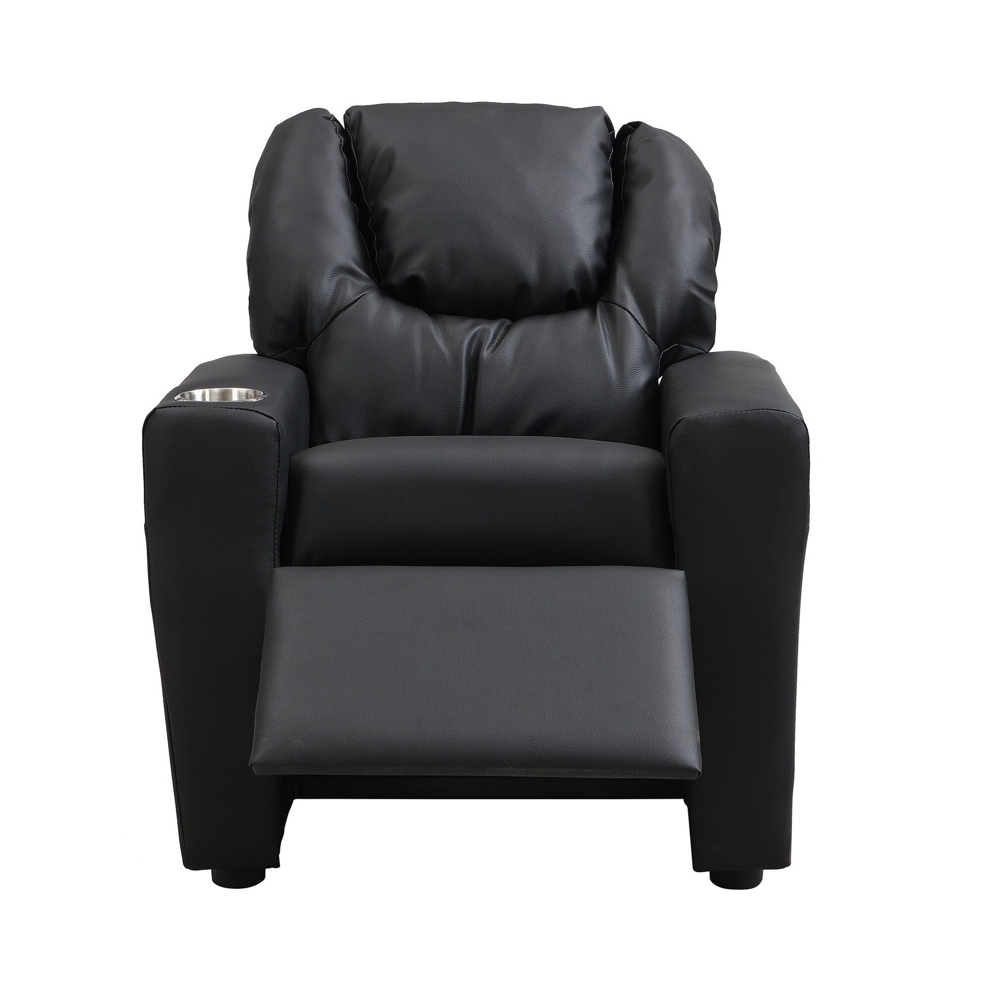 Fauteuil inclinable pour enfant en PVC noir, durable, avec porte-gobelet, design ergonomique, assemblage facile, capacité de 68 kg.