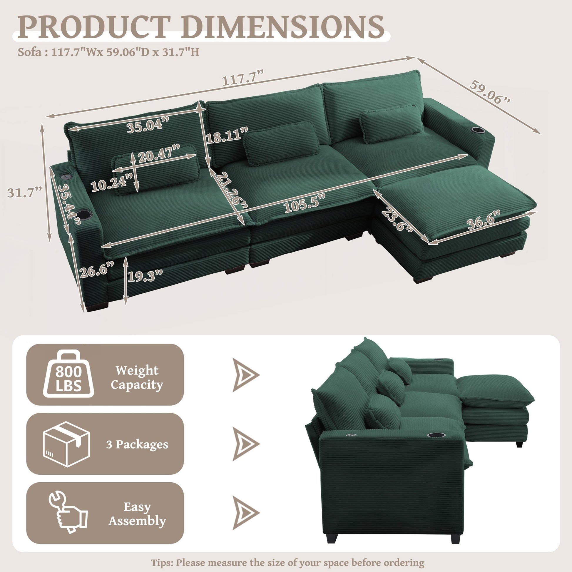 Canapé modulable 3 places en L avec ottoman. Port USB intégré et porte-gobelet pratique. Canapé 3 places avec ottoman de rangement. Idéal pour le salon, le bureau ou l'appartement. Le canapé est équipé de porte-gobelets de 9 cm sur les deux accoudoirs.