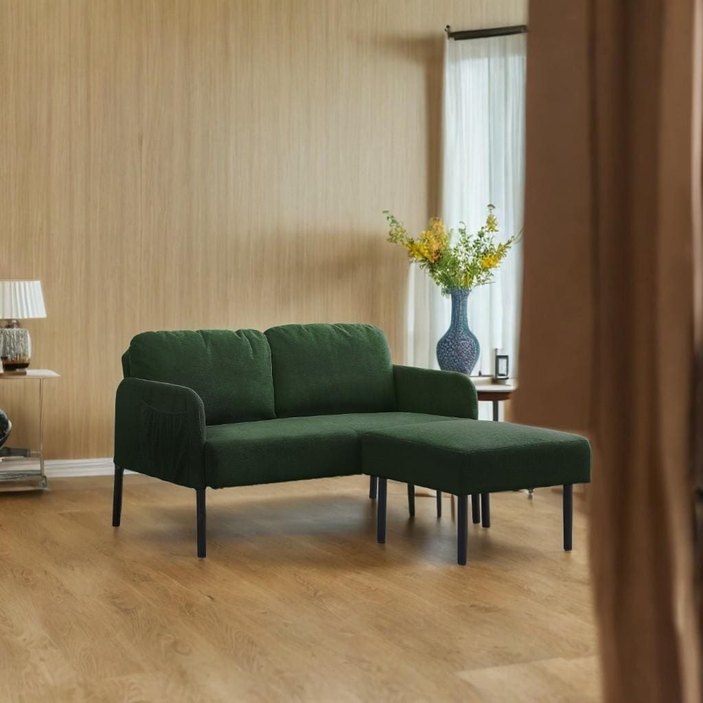 Canapé 2 places en L avec pouf, canapé causeuse moderne en tissu polyester, petit canapé confortable pour petits espaces