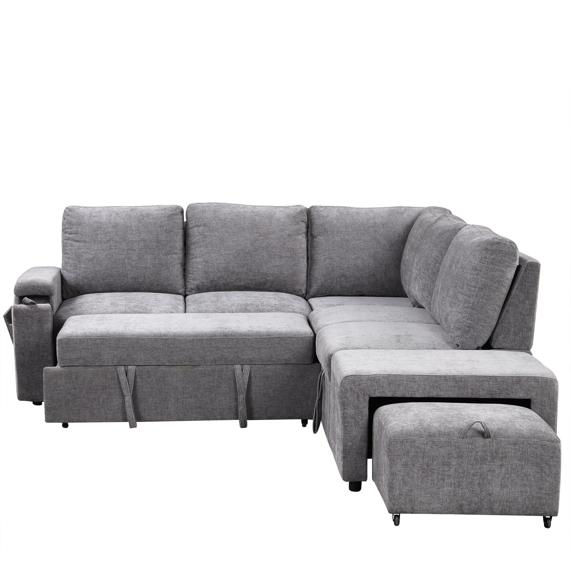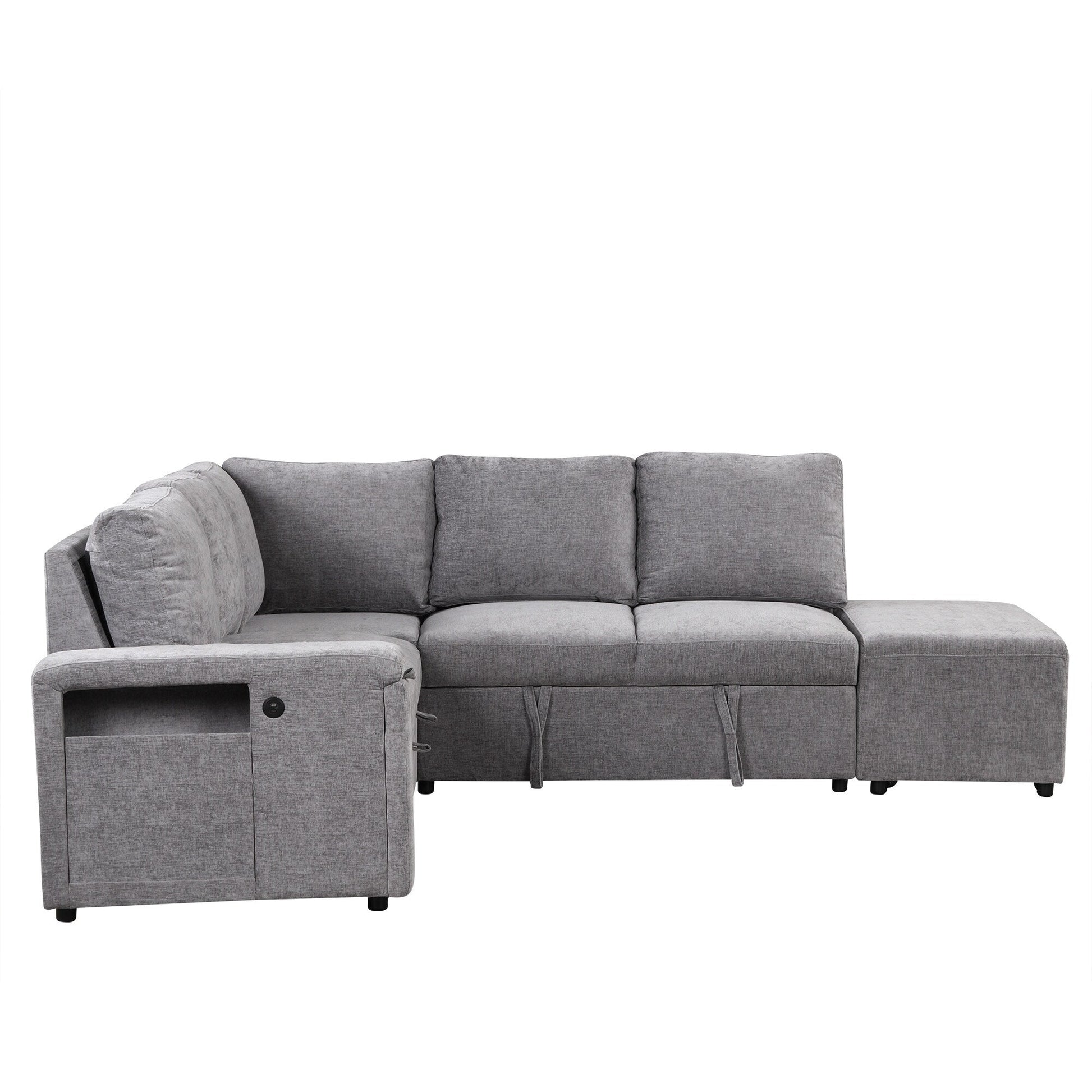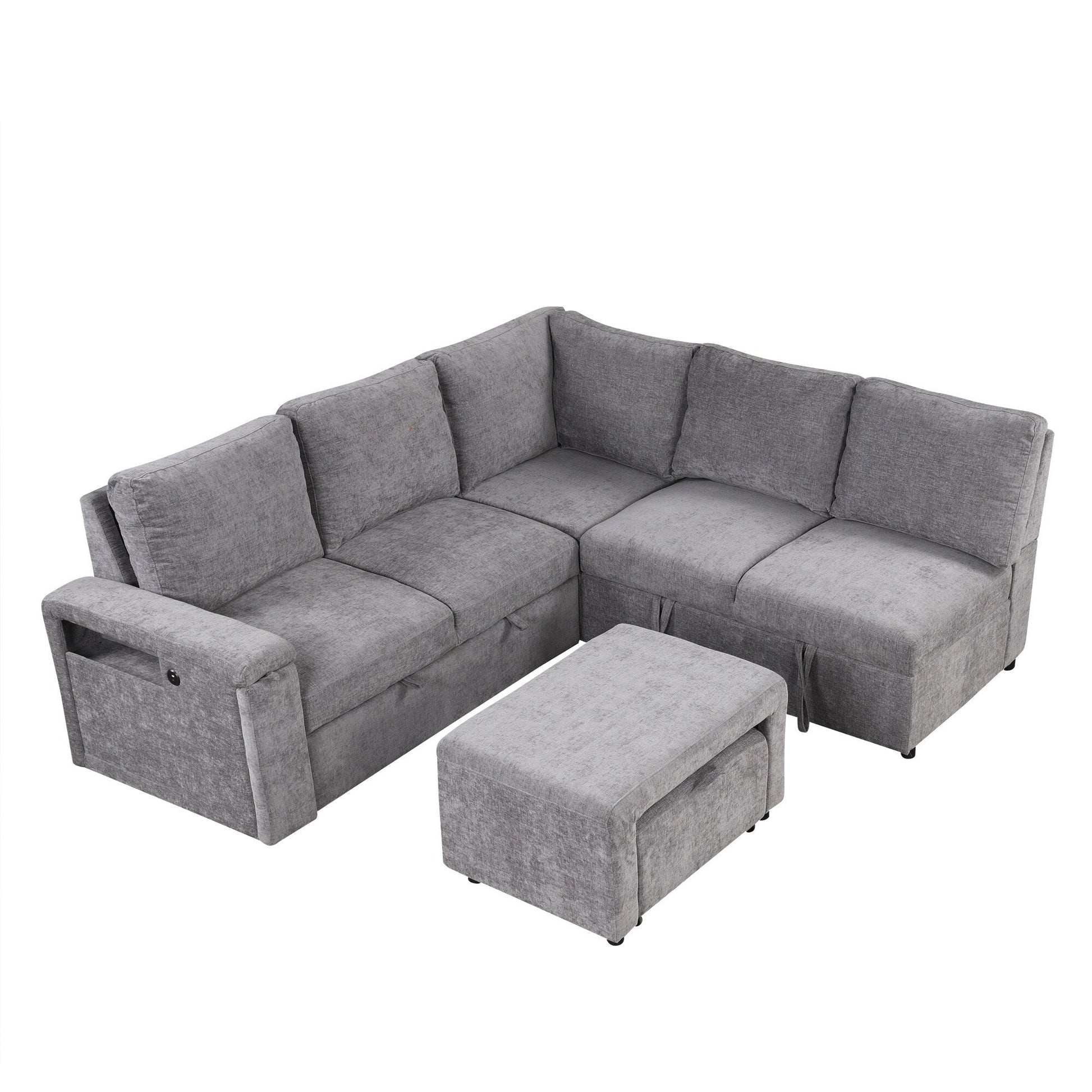 Canapé sectionnel 5 places en L avec pouf coulissant, porte-gobelets intégrés, port de chargement USB et coussins amovibles