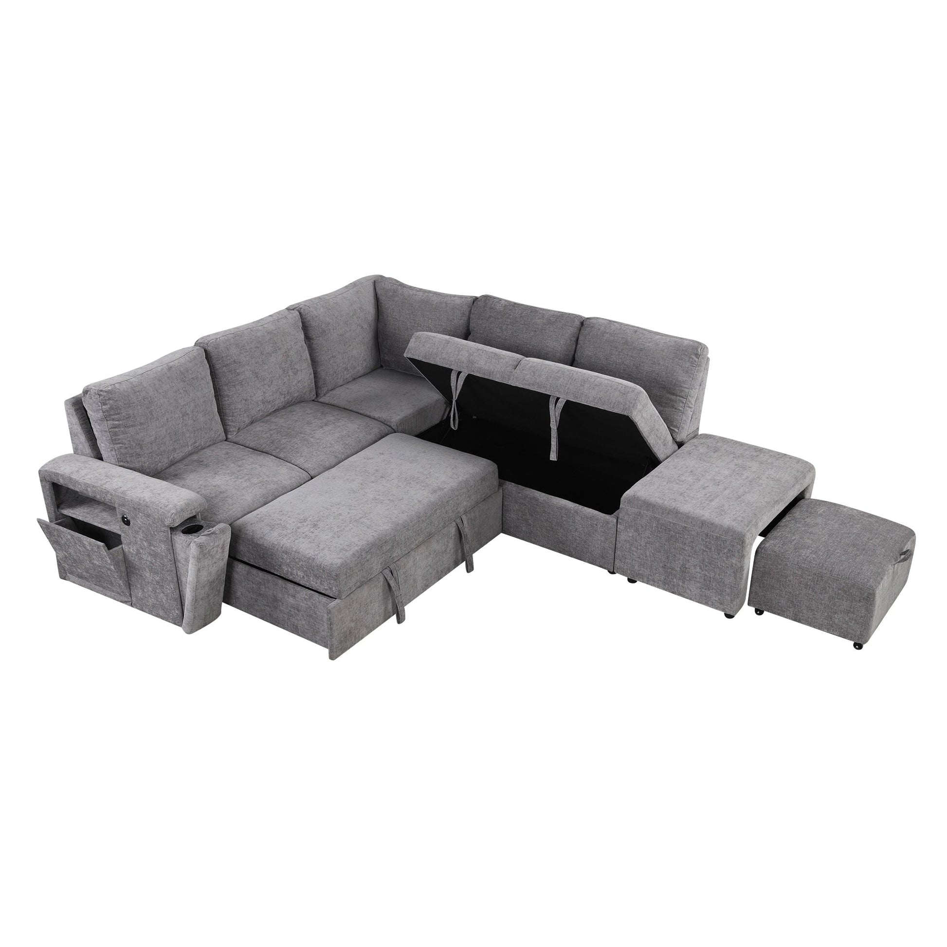 Canapé sectionnel 5 places en L avec pouf coulissant, porte-gobelets intégrés, port de chargement USB et coussins amovibles