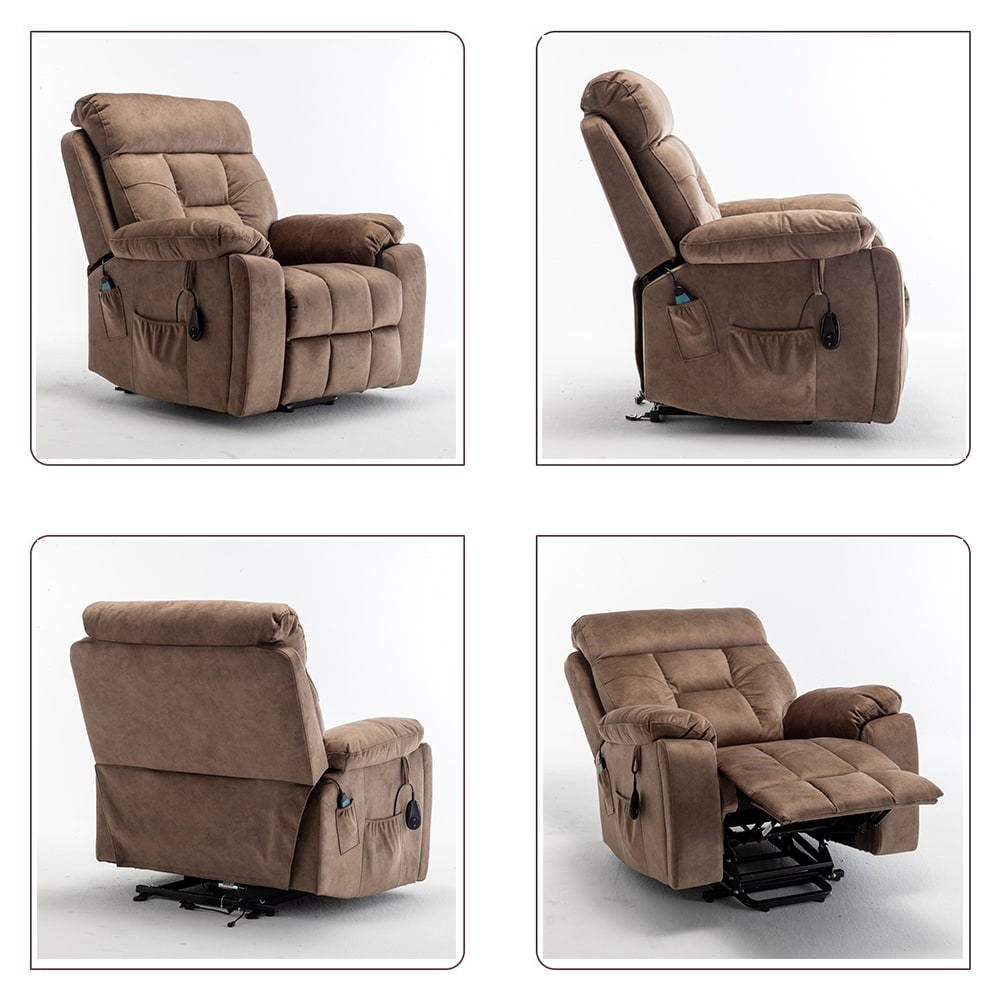 Nos fauteuils releveurs électriques, massants et chauffants, à large assise, sont robustes et peuvent supporter jusqu'à 150 kg. Ils sont faciles à utiliser pour les personnes âgées, même confrontées à divers obstacles au quotidien. Leur robuste structure aux coins renforcés en acier offre un confort optimal et une sécurité accrue. De plus, leur structure en bois dur robuste est conçue pour une utilisation durable. Ce fauteuil releveur électrique, massant et chauffant, équipé de coussins latéraux, est adapté aux personnes âgées. La fonction chauffante est située au niveau de la taille. Après environ 5 minutes d'activation, la chaleur est perceptible. Pour des raisons de sécurité, la température de chauffage est réglée à 38 °C, ce qui peut rendre la sensation de chaleur discrète.