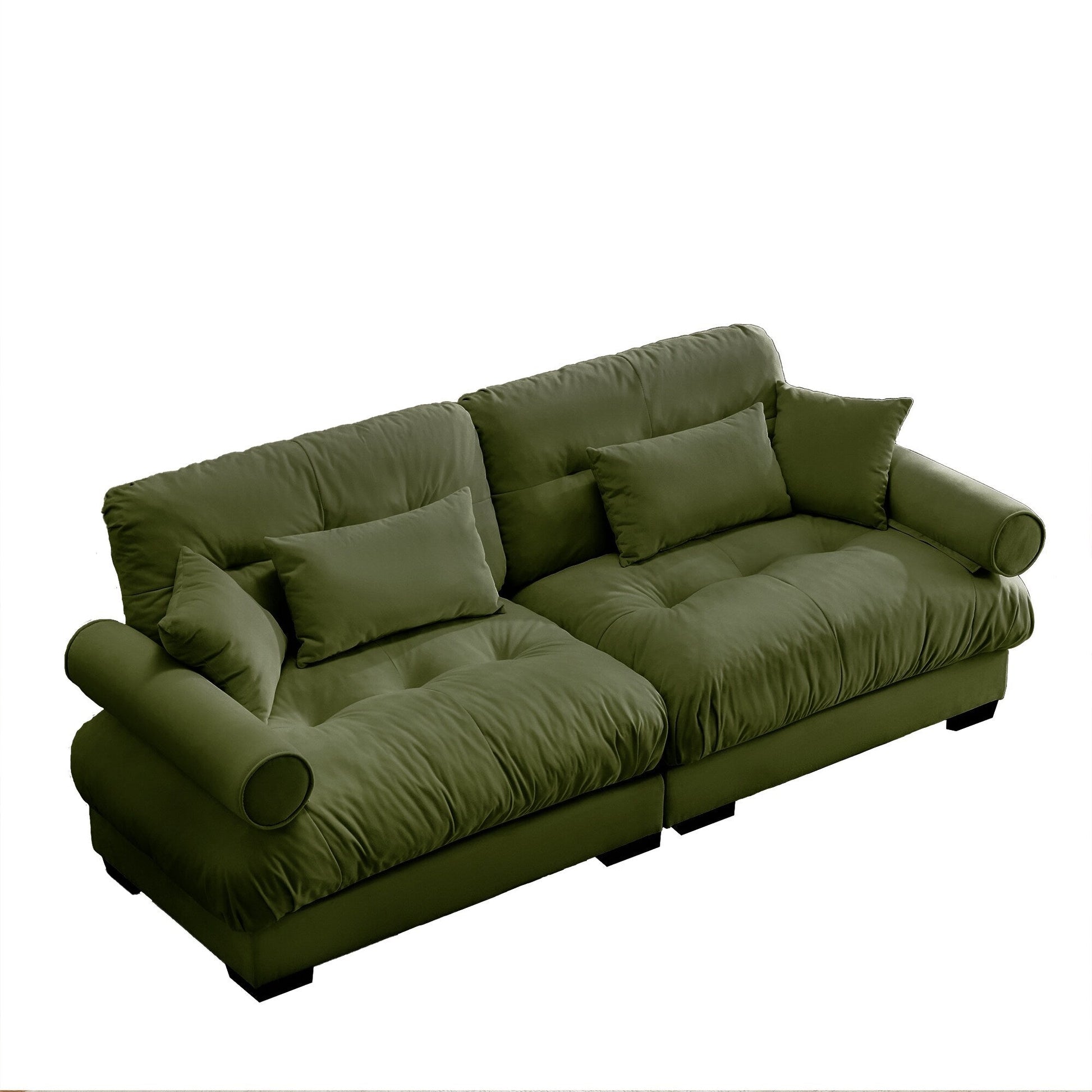Canapé deux places moderne de grande taille avec accoudoirs renforcés, canapé deux places en velours avec coussins de taille et coussins décoratifs