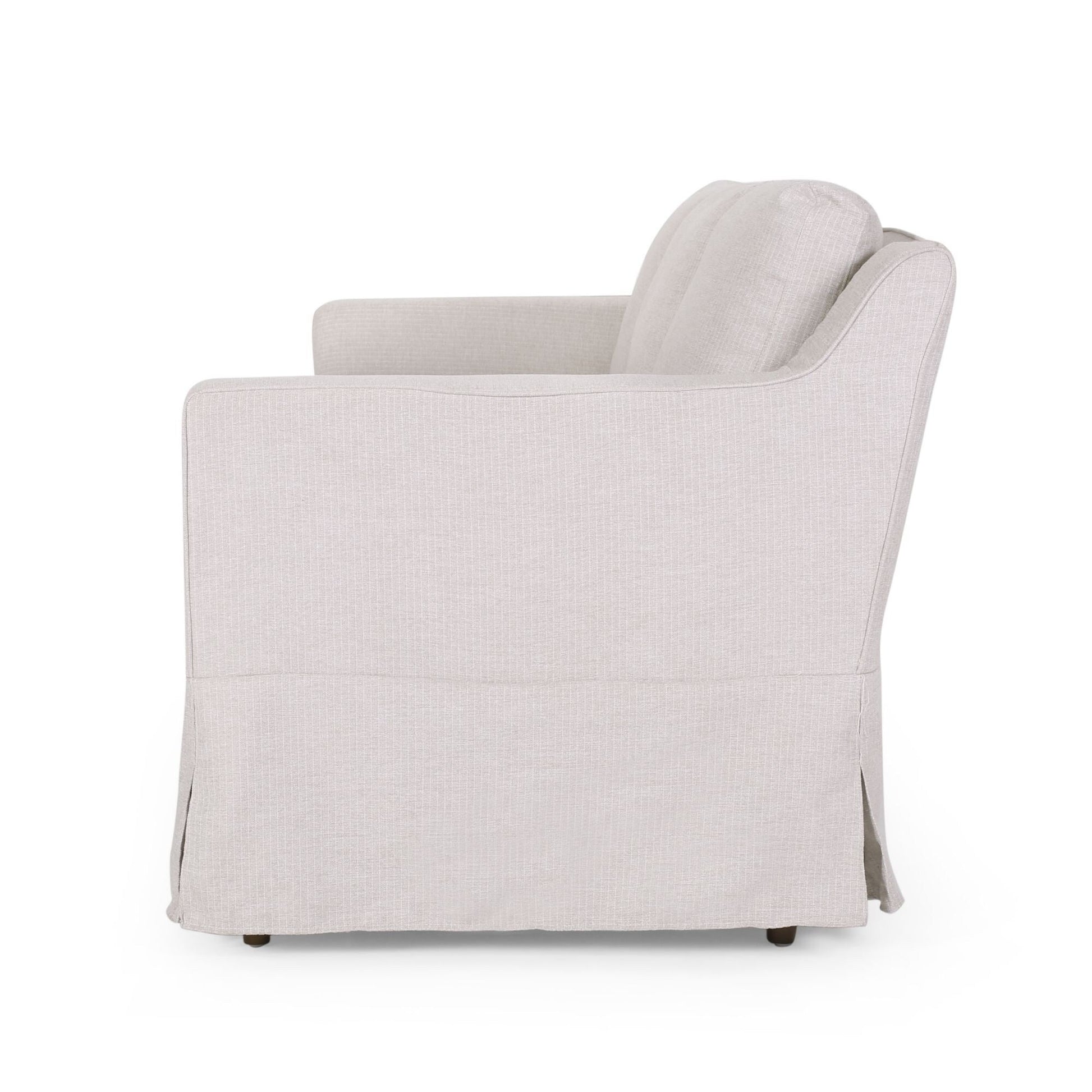 Canapé 3 places en tissu rayé beige clair 79 avec accoudoirs encastrés et jupe pour salon