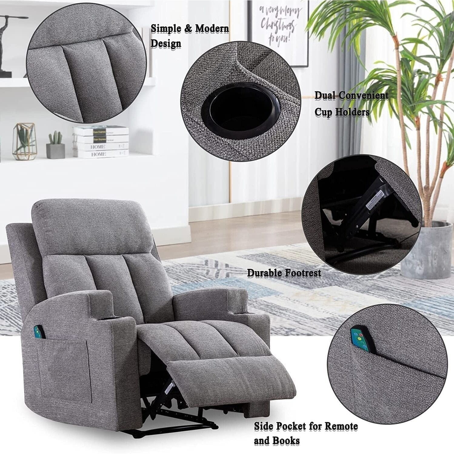 Profitez d'un confort et d'une détente ultimes avec notre fauteuil inclinable massant avec chauffage et vibrations. Ce fauteuil inclinable est doté de 8 points de massage (dos, lombaires, cuisses et jambes) et d'un point chauffant au niveau des lombaires, soulageant efficacement les douleurs et la fatigue. Son tissu respirant et sa mousse haute densité offrent confort et soutien à votre dos et à vos lombaires. Grâce à ses porte-gobelets pratiques, sa poche latérale et son repose-pieds facile à utiliser, ce fauteuil est idéal pour lire, regarder la télévision, dormir ou se lever. Son montage est un jeu d'enfant et peut être effectué par une seule personne en quelques minutes seulement.