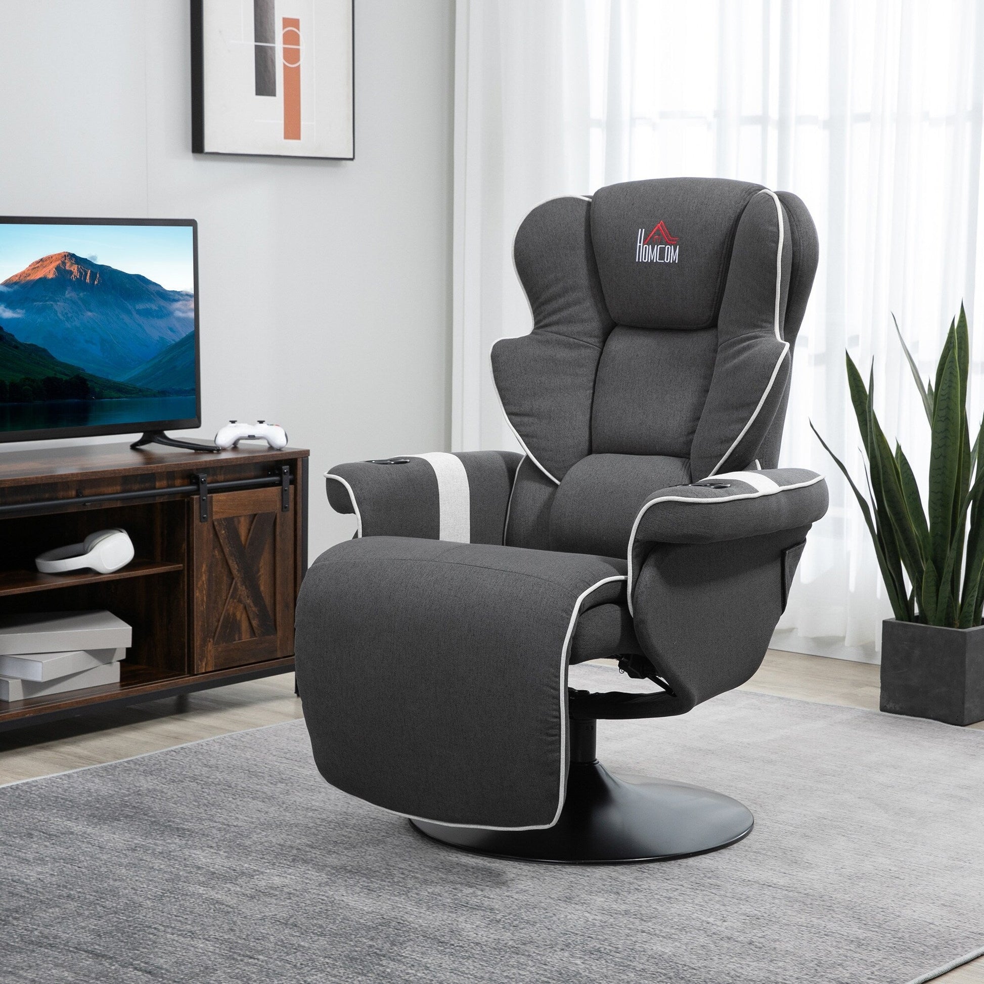 Fauteuil inclinable pivotant manuel, fauteuil de salon rembourré en lin avec dossier réglable, repose-pieds et deux porte-gobelets