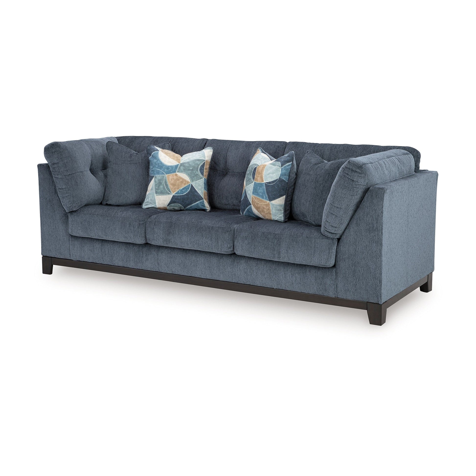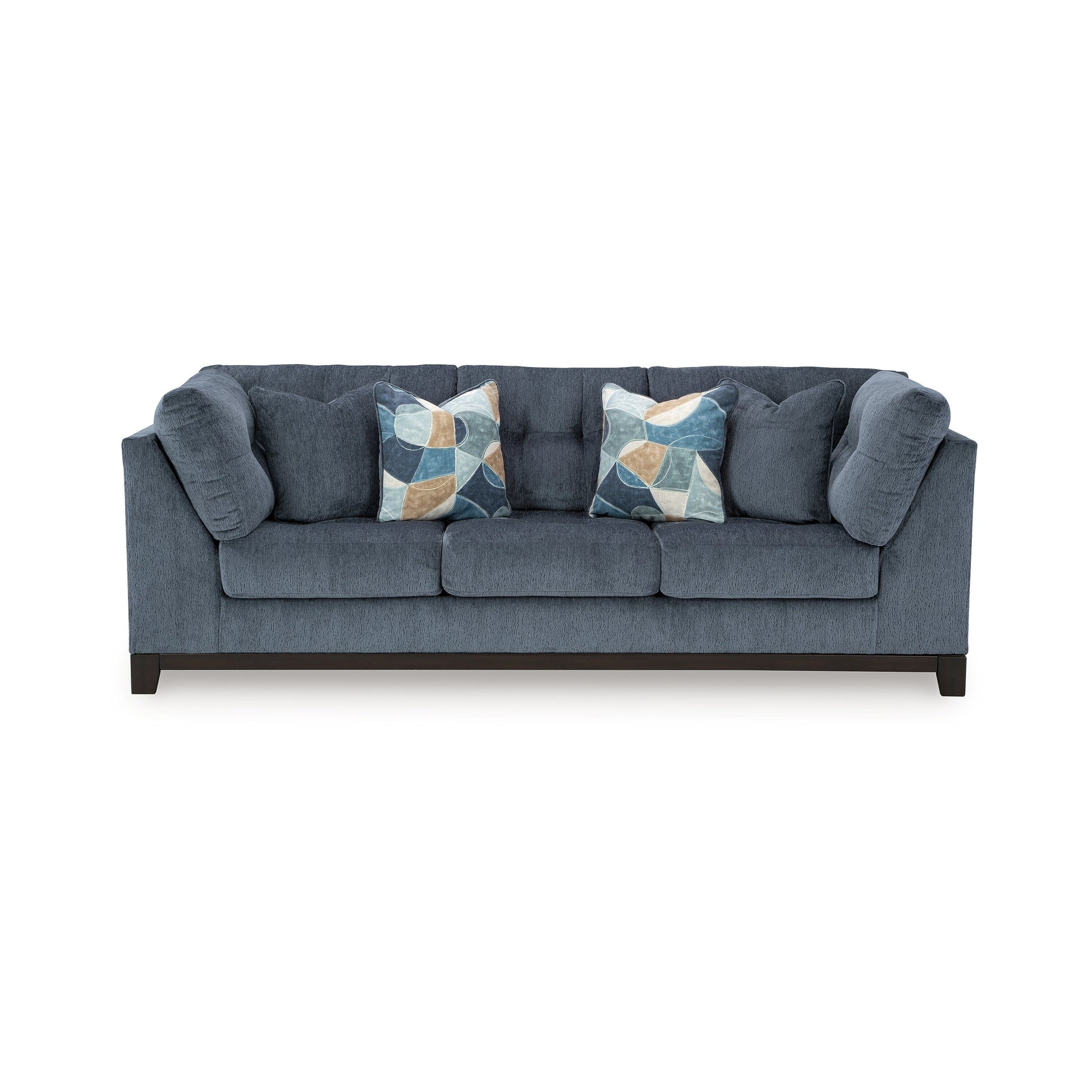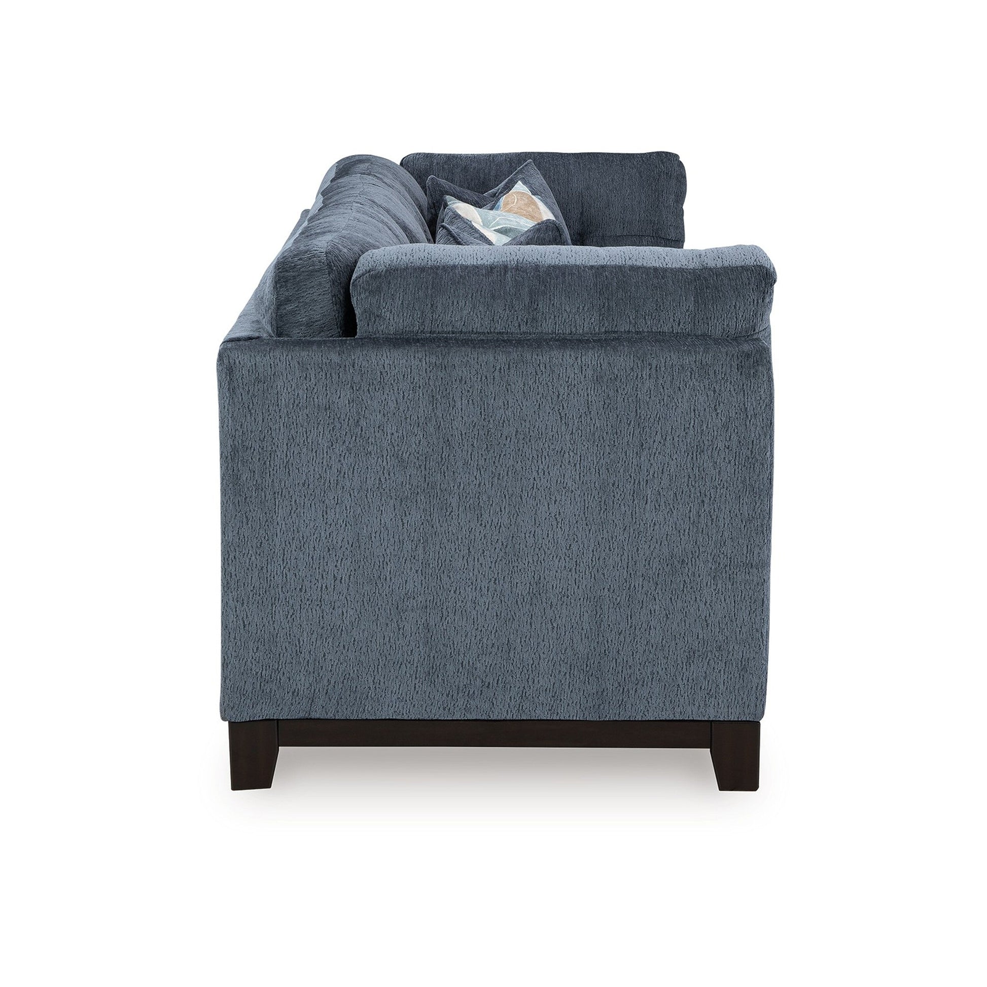 Canapé Maxo, 254 cm, capitonné, polyester bleu riche, 5 coussins décoratifs