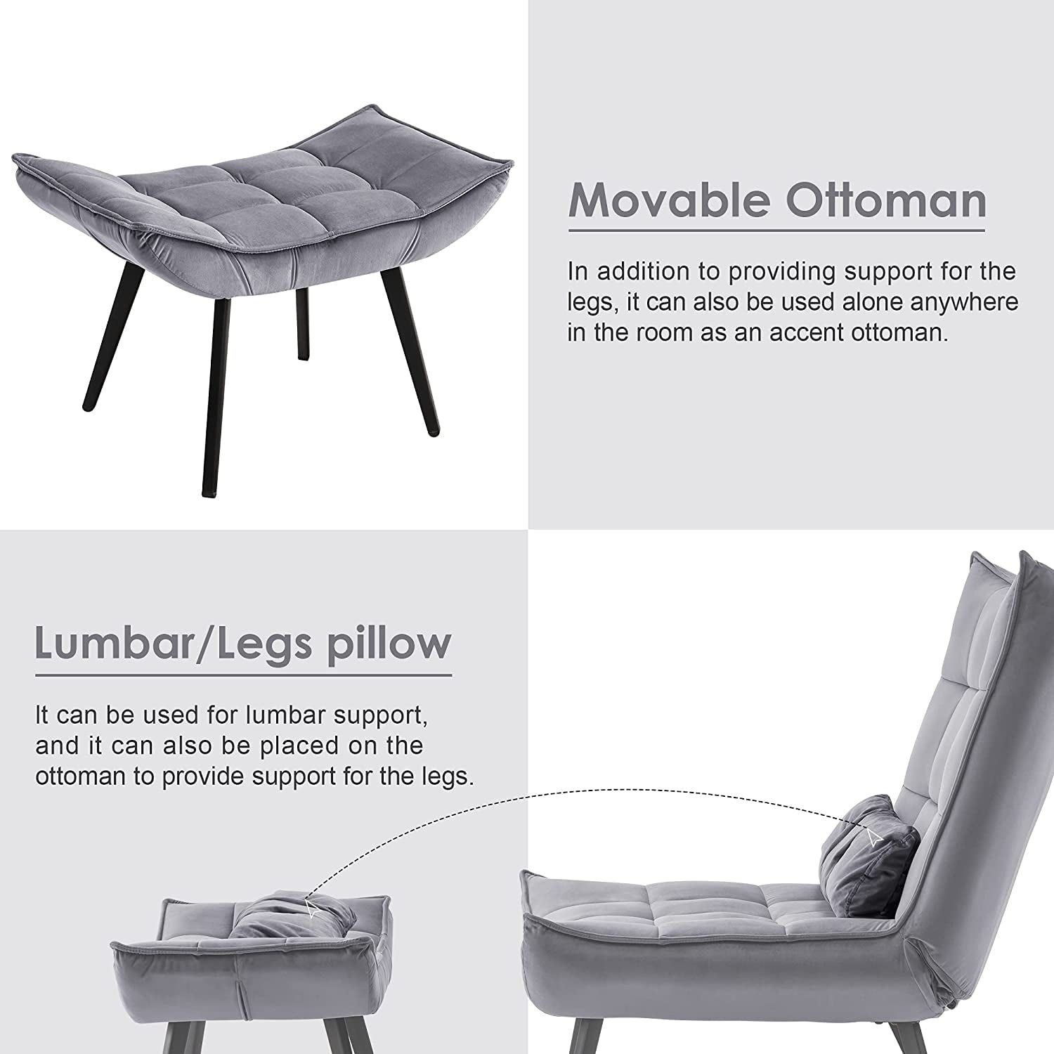 - Chaise polyvalente avec ottomane : la chaise longue Mcombo peut être utilisée comme coiffeuse, fauteuil d'appoint, fauteuil d'appoint, fauteuil club, fauteuil de lecture, etc. Cette chaise en velours est parfaite pour décorer votre salon, chambre, salle à manger, bureau et chambre d'amis. Son ottoman à surface incurvée et mobile offre un confort optimal et maintient vos jambes en place. Elle peut être placée sur une chaise pour gagner de la place lorsqu'elle n'est pas utilisée.