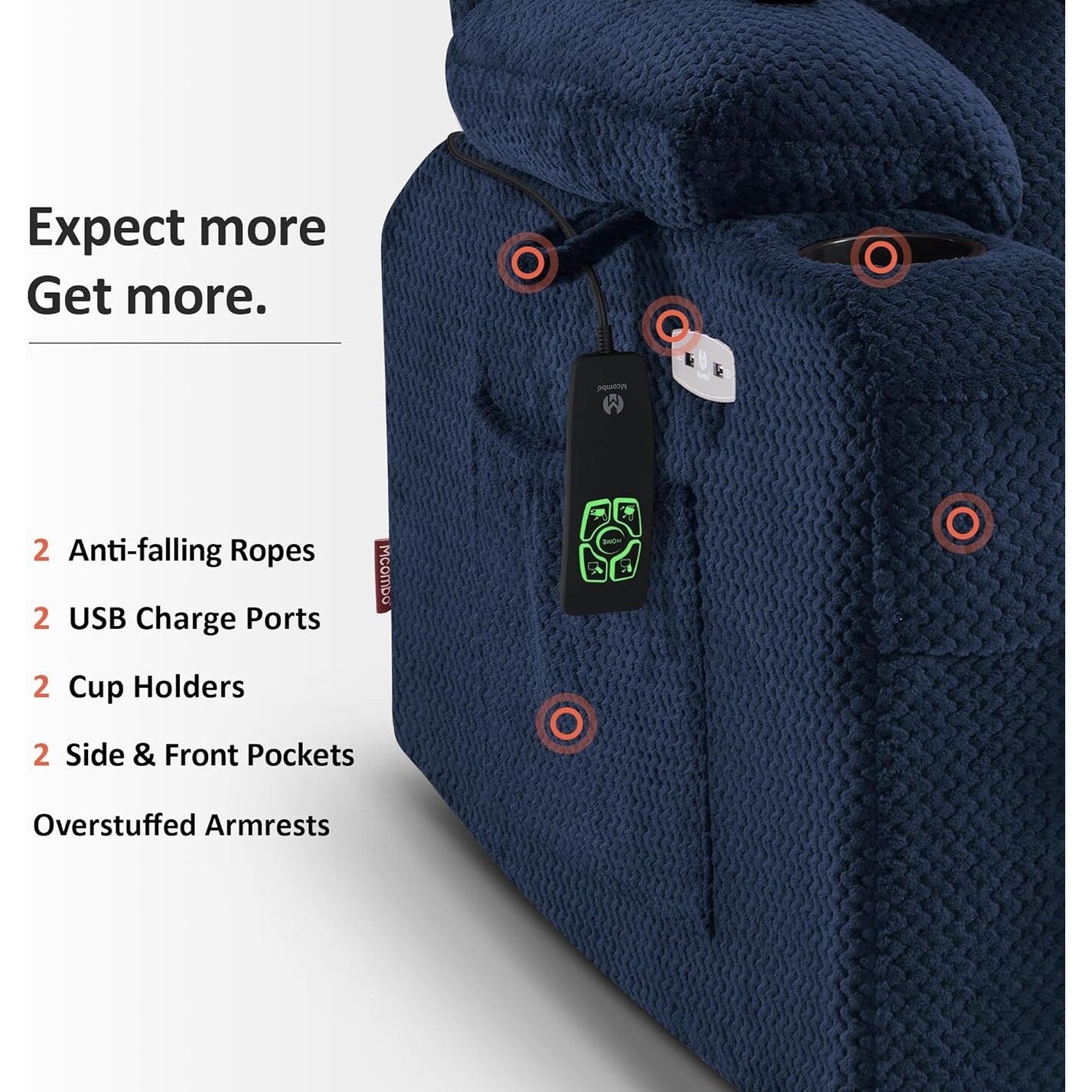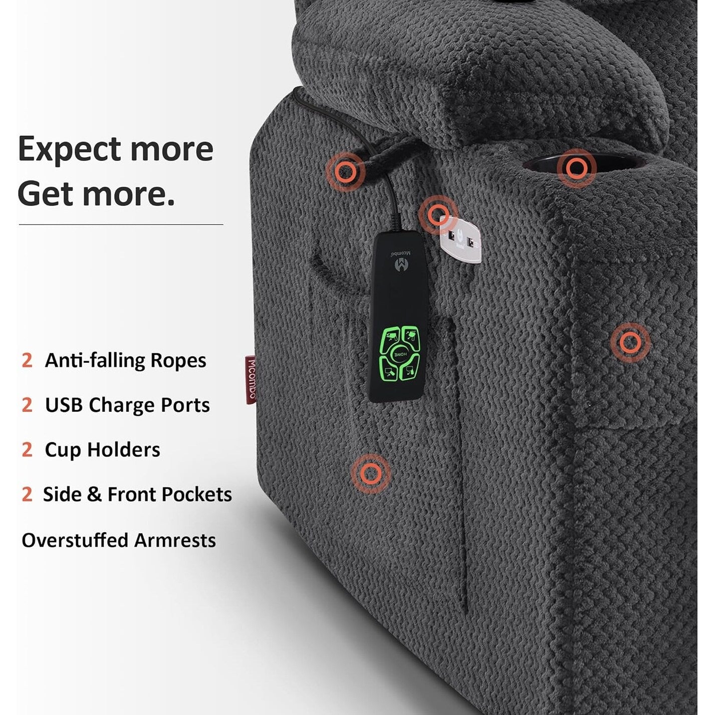 - Ports de chargement USB et porte-gobelets : Les deux ports USB et les porte-gobelets du fauteuil inclinable vous permettront de poser votre boisson sur le porte-gobelet et de charger vos appareils mobiles tout en profitant d'un film ou de vos applications préférées.