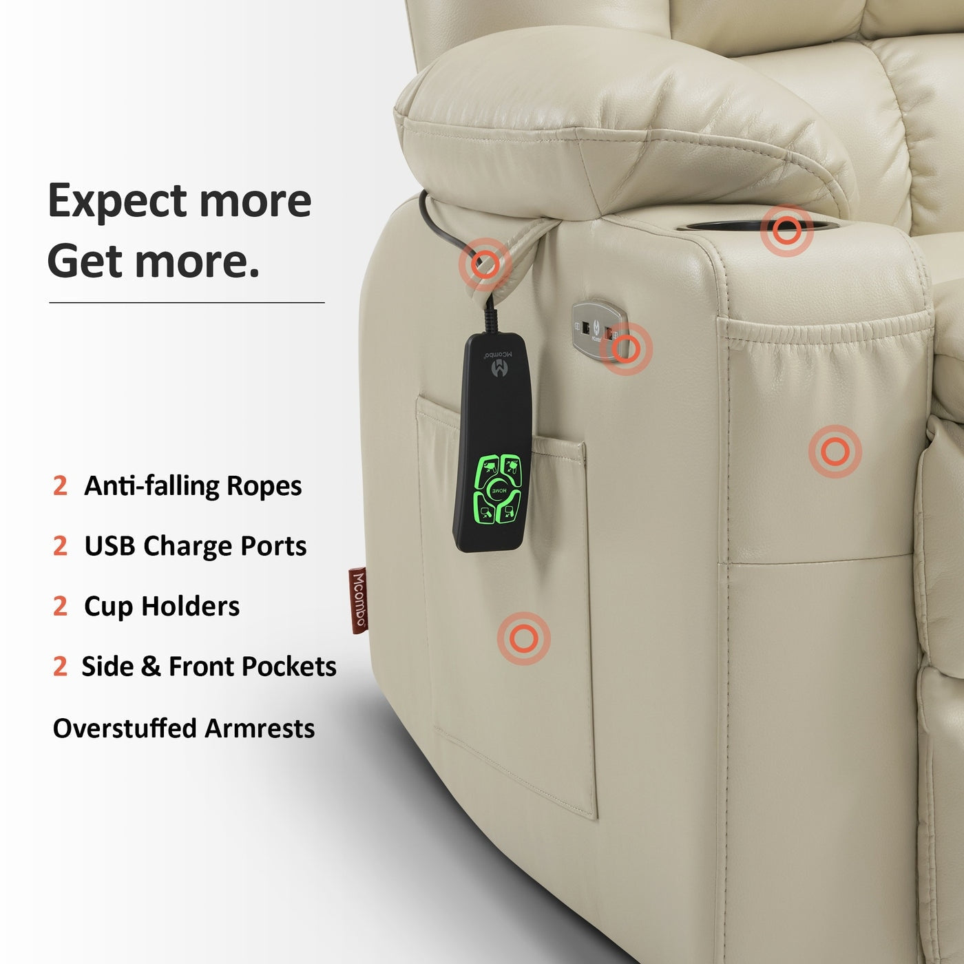- Ports de chargement USB et porte -gobelets : Les deux ports USB et les porte-gobelets du fauteuil inclinable vous permettront de poser votre boisson sur le porte-gobelet et de charger vos appareils mobiles tout en profitant d'un film ou de vos applications préférées