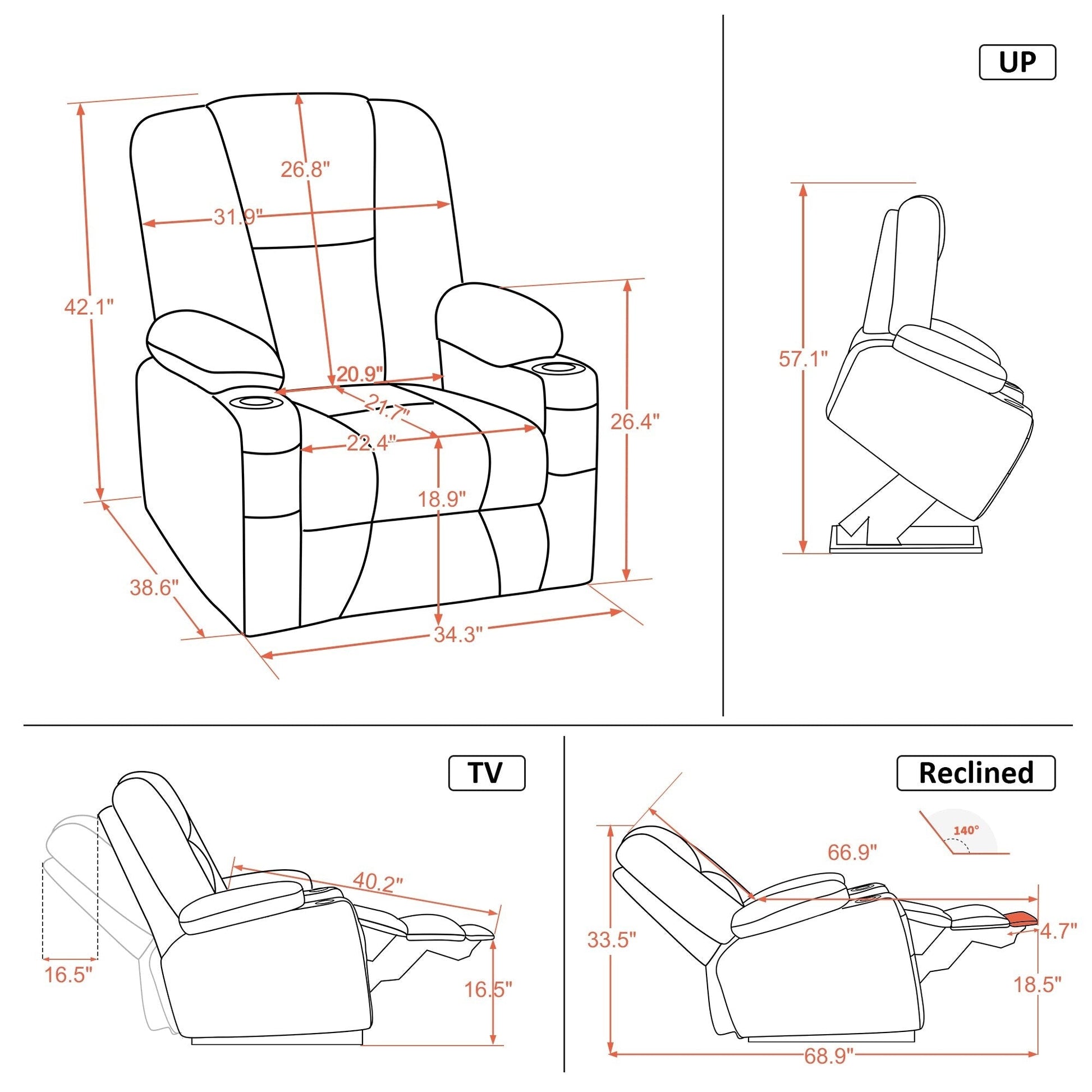 - Assistance de levage électrique : Le mécanisme de levage à contrepoids avec actionneur standard ASTM pousse toute la chaise vers le haut pour aider l'utilisateur à se lever facilement sans ajouter de stress au dos ou aux genoux, ajustez-le en douceur à la position de levage ou d'inclinaison que vous préférez en appuyant sur deux boutons de la télécommande.