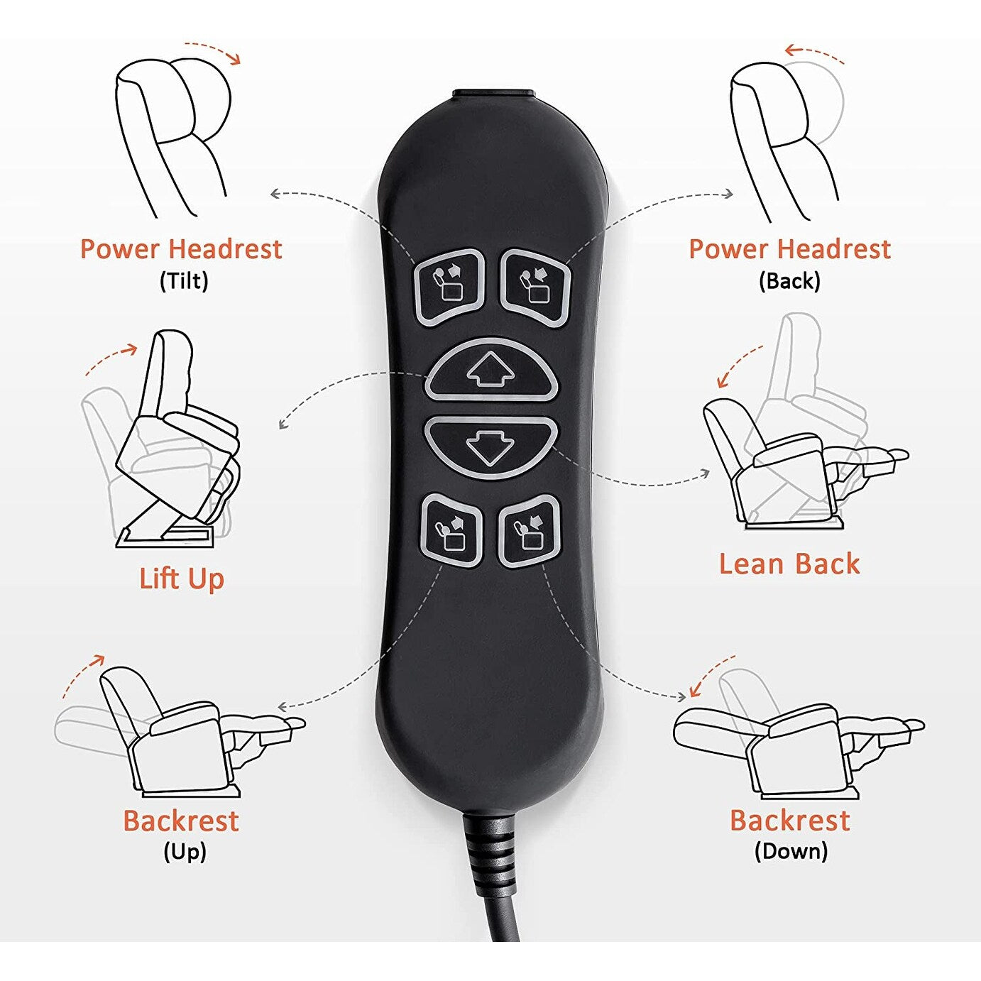 - Appuie-tête électrique : L'appui-tête réglable offre un confort personnalisé en position assise droite, spécialement conçu pour permettre à une personne inclinée en arrière de regarder vers l'avant, par exemple vers la télévision, sans forcer la tête ou le cou