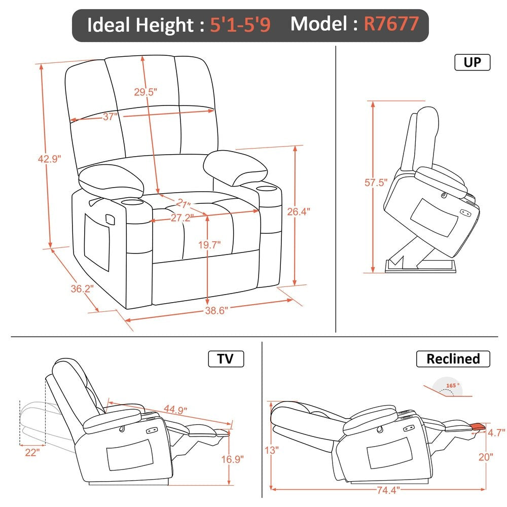 - Position infinie : Grâce au double moteur intégré, vous pouvez régler le dossier et le repose-pieds indépendamment dans la position infinie souhaitée, soulever, regarder la télévision et vous allonger à plat (angle d'inclinaison maximal : 165°)