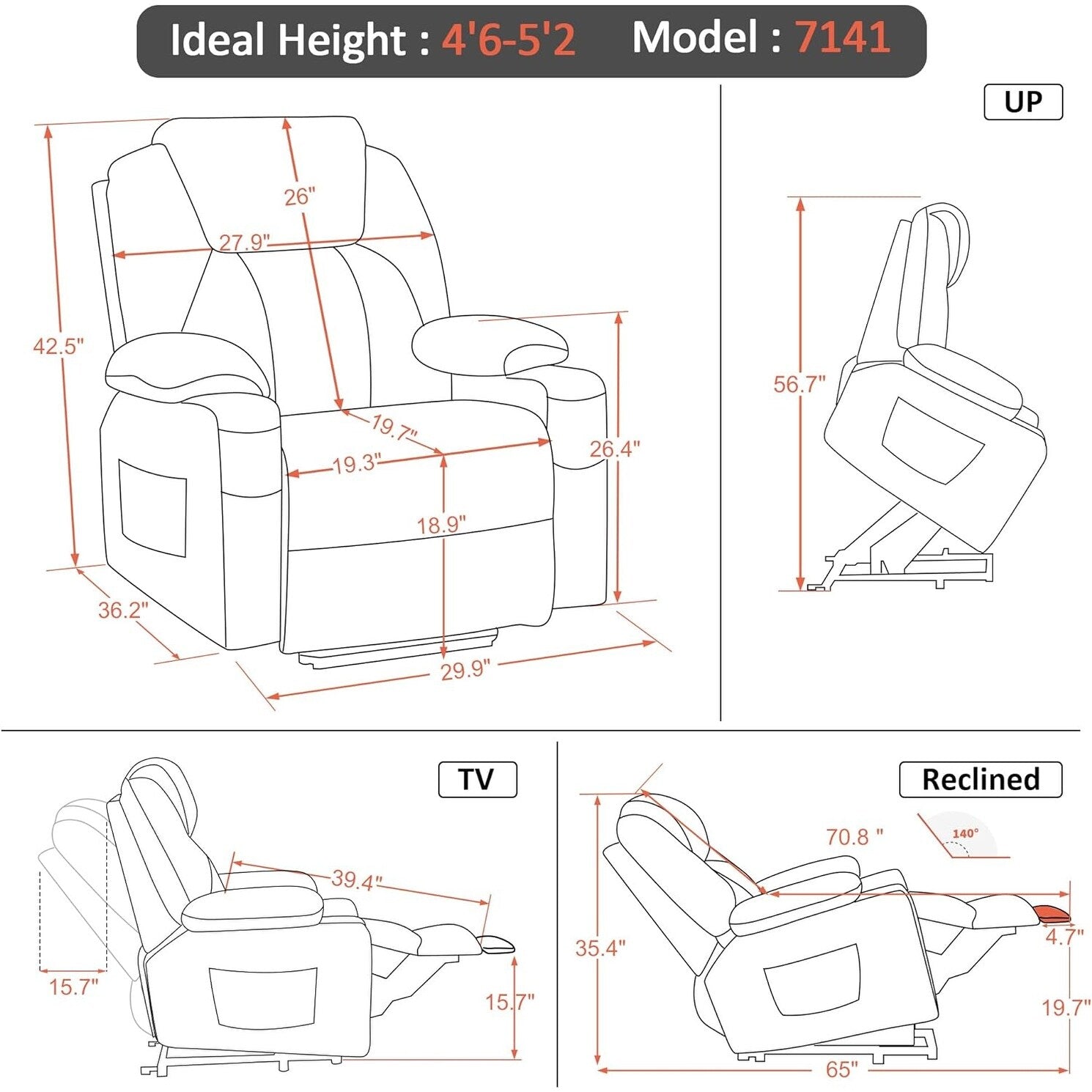 - Spécialement conçu pour les personnes de petite taille : Ce fauteuil releveur est parfaitement dimensionné pour s'adapter à votre taille. Il est spécialement conçu pour les personnes mesurant entre 1,40 m et 1,57 m. La largeur, la profondeur et la hauteur d'assise du fauteuil s'adaptent à votre taille.