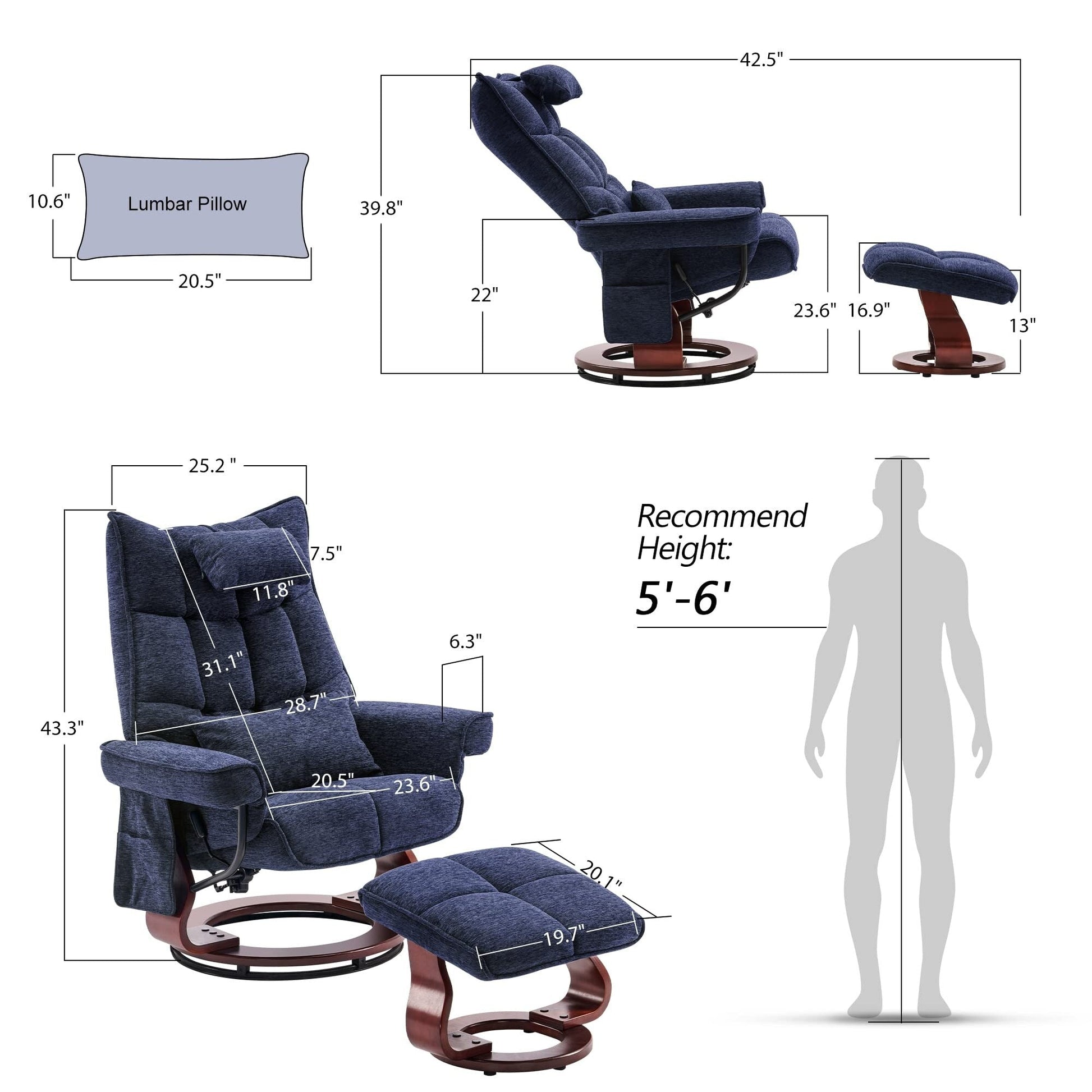 Fauteuil inclinable pivotant MCombo avec ottoman et coussin de nuque, tissu chenille