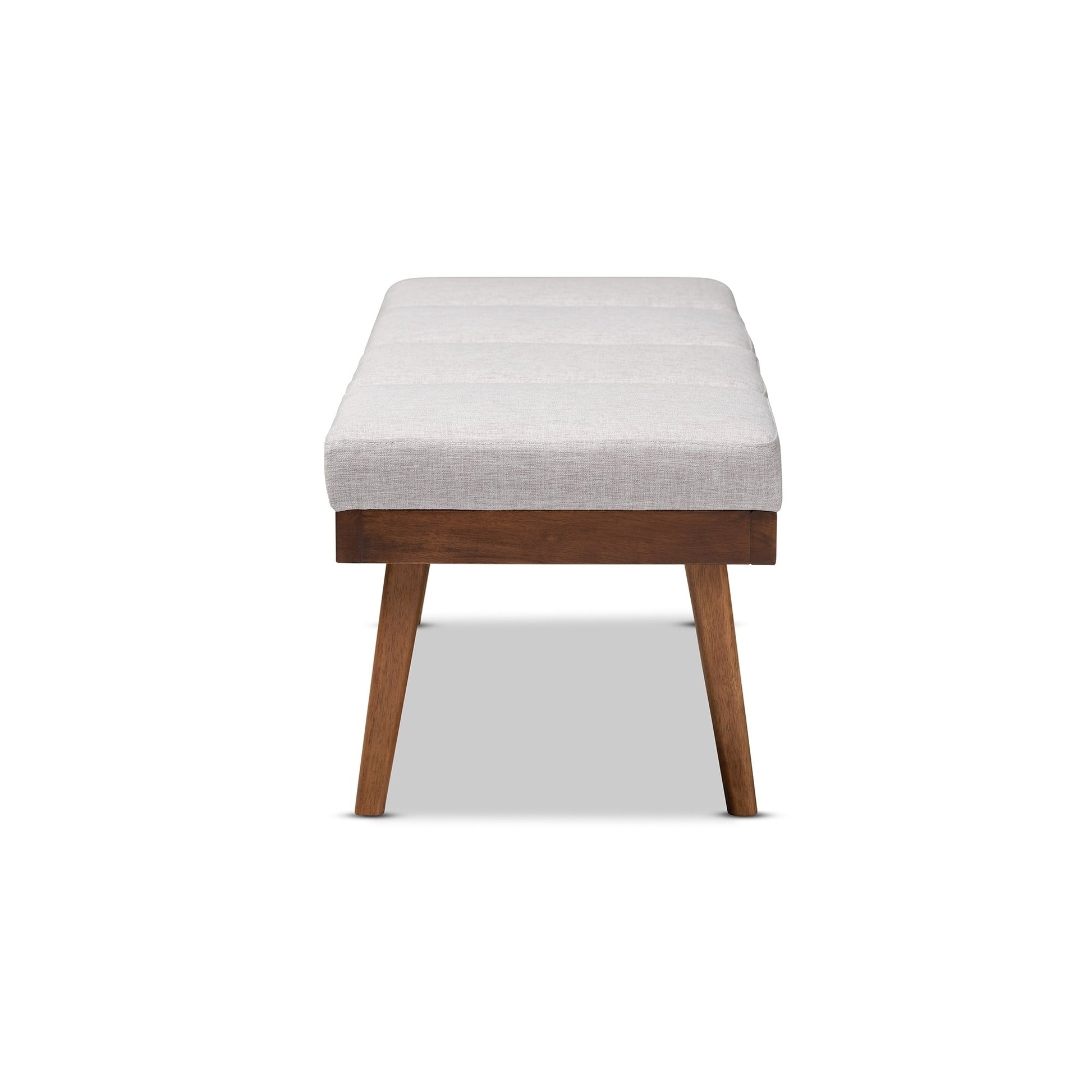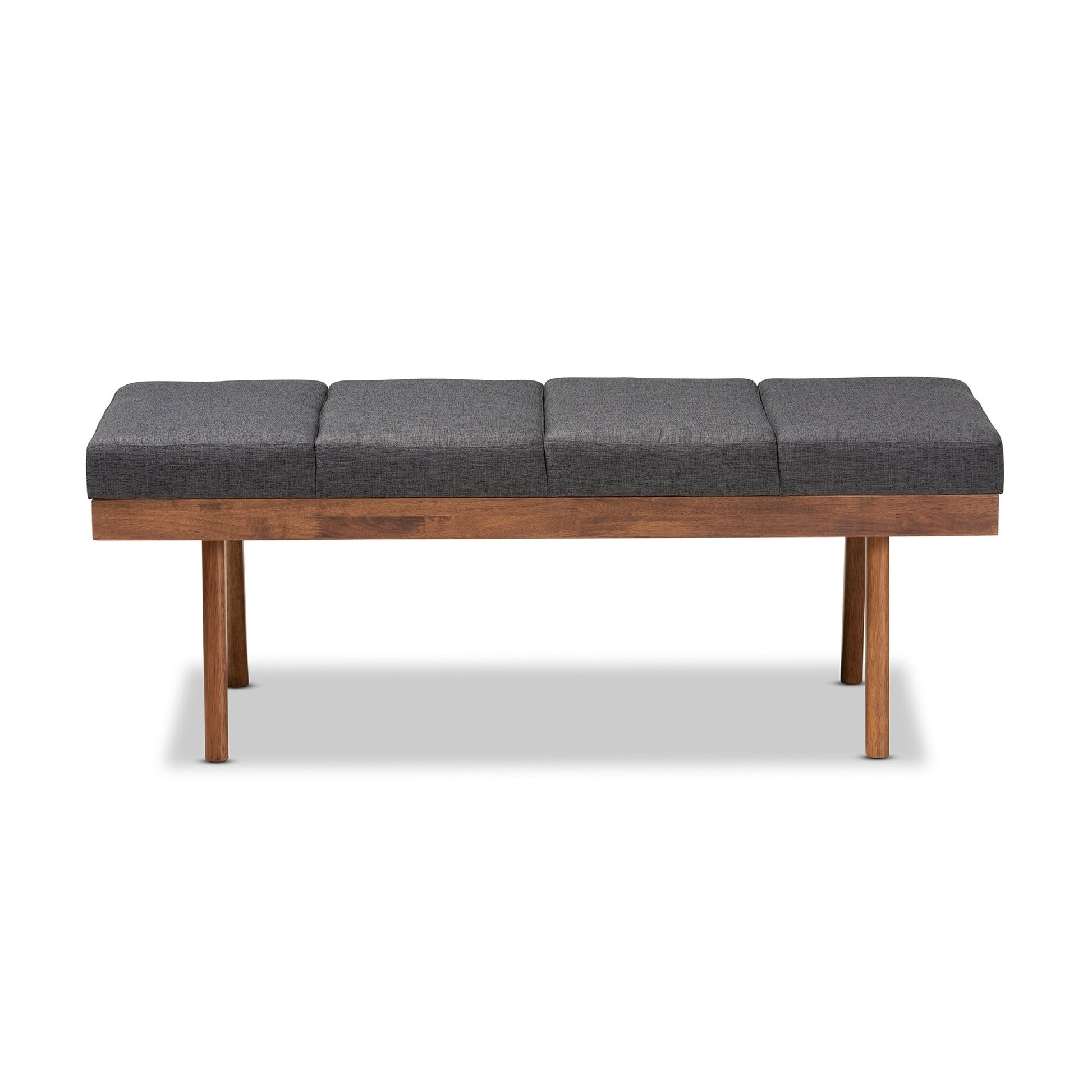 Donnez à votre entrée ou à votre chambre une touche de charme rétro avec le banc Larisa. Ce banc en bois est recouvert d'un tissu polyester neutre, doux et résistant, qui s'harmonise avec la finition brun noyer du bois. Son confort d'assise est assuré par un rembourrage en mousse moelleuse, rehaussé par le capitonnage à canaux.