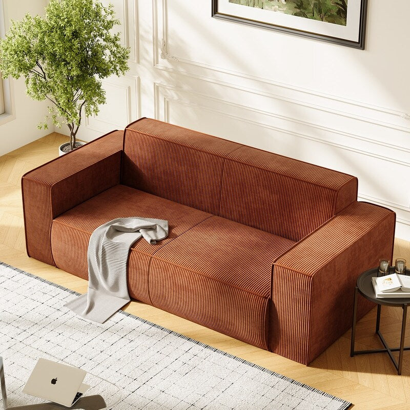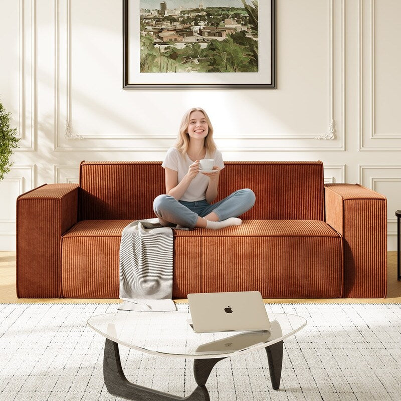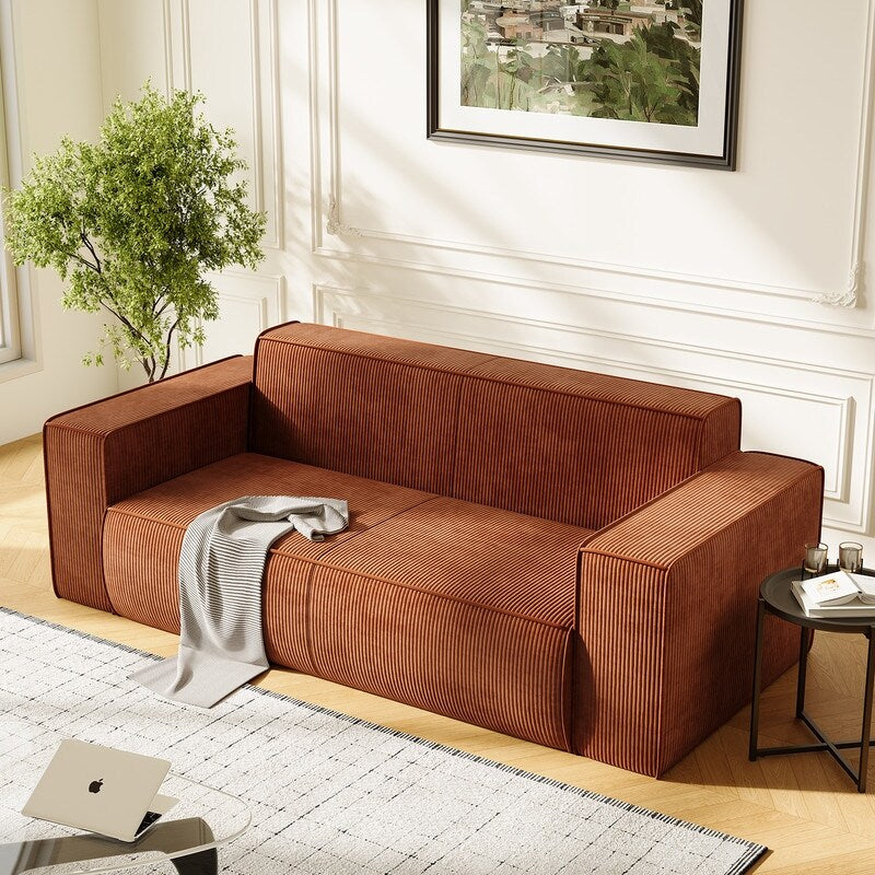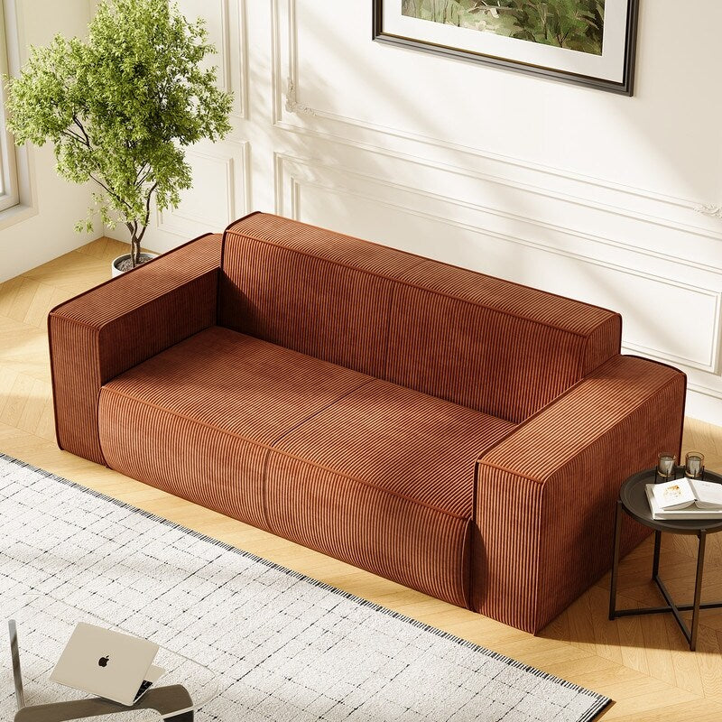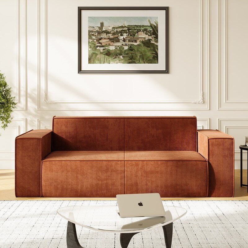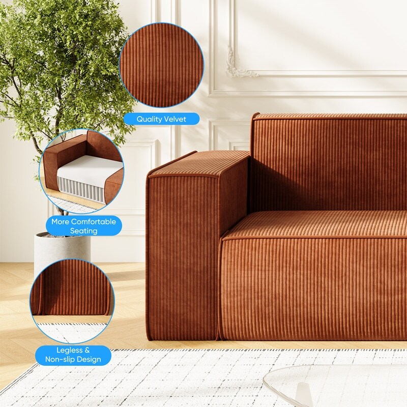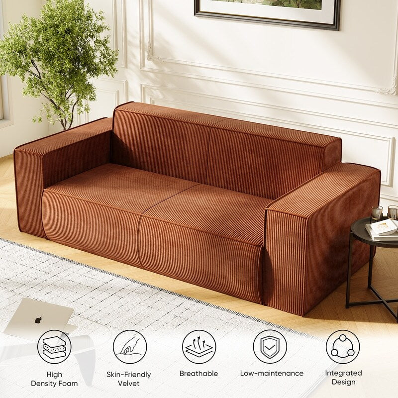 Canapé 2 places en velours moderne Mixoy, sans pieds et avec accoudoirs élargis, rembourré pour le salon